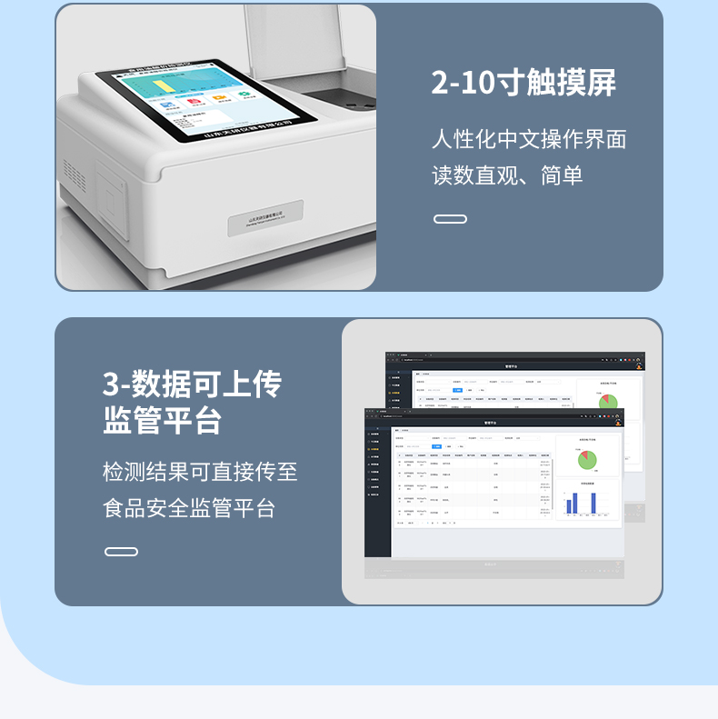 | 儀器采用臺式一體化系統(tǒng)檢測技術(shù),將分光光度模塊、新型農(nóng)殘檢測模塊、數(shù)字化管理模塊、無線通訊模塊高度集成于一體,支持檢測200種食品安全檢測項(xiàng)目,同時(shí)預(yù)留升級檢測方法。 | 儀器檢測模塊標(biāo)準(zhǔn)化、智能化,可隨意自由組合。檢測箱體內(nèi)置多個(gè)標(biāo)準(zhǔn)檢測單元,檢測模塊可以調(diào)整配置。 | 儀器采用全新安卓智能系統(tǒng),主控芯片采用 ARM Cortex-A7,RK3288/4核處理器,10.1寸高清液晶觸摸豎屏,更加**的UI交互界面,運(yùn)轉(zhuǎn)快捷;儀器配備無線通信模塊: 4G(APN)通訊模塊、Wifi模塊,藍(lán)牙傳輸,同時(shí)具有雙USB接口以及RJ45接口能以多種方式實(shí)現(xiàn)數(shù)據(jù)保存和數(shù)據(jù)傳輸功能。 | 創(chuàng)新檢測模式: | ★檢測通道:≥12通道;采用精密旋轉(zhuǎn)比色池設(shè)計(jì),使用同芯片同光源校準(zhǔn)精度,解決不同光源之間的誤差值。1-12通道間誤差0.1%。(**號:ZL202022821055.2) | ★儀器具有自動(dòng)識別比色皿檢測功能,即:將樣品比色皿放入儀器后,點(diǎn)擊樣品檢測,儀器自動(dòng)識別比色皿進(jìn)行通道檢測。 | 進(jìn)口高精光源: | 高精度進(jìn)口四波長冷光源,通道配置 410、520、590、630nm 波長光源,一個(gè)光源芯片驅(qū)動(dòng)一個(gè)光源,誤差極小,每臺設(shè)備單獨(dú)**校準(zhǔn)光源,**比對,同時(shí)參照四種不同波段光源全方位覆蓋市面上99%的農(nóng)殘食品項(xiàng)目檢測。 | 智能化操作系統(tǒng): | 便捷操作系統(tǒng):設(shè)備檢測時(shí)可在同一檢測界面自動(dòng)對應(yīng)相關(guān)檢測通道一次性選擇1-12個(gè)樣品名稱,無須退出界面,節(jié)省操作時(shí)間。 | 數(shù)據(jù)集成系統(tǒng):設(shè)備首頁自動(dòng)統(tǒng)計(jì)檢測數(shù)據(jù)包含:周檢測數(shù)據(jù)、月檢測數(shù)據(jù),全部檢測總數(shù)量,均包含檢測總數(shù),合格數(shù),不合格數(shù),以及相關(guān)柱形分析圖,對各項(xiàng)檢測數(shù)據(jù)清晰掌握,無需電腦查詢,更加快捷直觀。 | 項(xiàng)目預(yù)設(shè)系統(tǒng):支持添加單個(gè)及多個(gè)相同或不相同的任務(wù)預(yù)設(shè),一鍵快速調(diào)取,每一個(gè)任務(wù)分別可以設(shè)置不同的樣品、批次、編號、來源、備注、抽樣信息、檢測信息、受檢信息、復(fù)核信息等更多信息。無縫鏈接平臺和APP實(shí)時(shí)查看下發(fā)任務(wù)。 | 數(shù)據(jù)監(jiān)管系統(tǒng):同步對接監(jiān)管平臺,數(shù)據(jù)可局域網(wǎng)和互聯(lián)網(wǎng)數(shù)據(jù)上傳,檢測結(jié)果可選擇直接傳至食品安全監(jiān)管平臺。集成OSS輸出存儲服務(wù)、區(qū)分設(shè)備定向管理應(yīng)用,進(jìn)行區(qū)域食品安全監(jiān)管及大數(shù)據(jù)分析處理與數(shù)據(jù)統(tǒng)計(jì),檢測區(qū)域食品安全長短期動(dòng)態(tài),達(dá)到食品安全問題預(yù)估、預(yù)警。 | 自定義打印系統(tǒng):內(nèi)置全新打印系統(tǒng),新創(chuàng)自定義打印方式,可按需靈活設(shè)置開啟或關(guān)閉:產(chǎn)品合格證(國家農(nóng)業(yè)部標(biāo)準(zhǔn)要求),二維碼,抽樣信息、檢測信息,受檢信息、復(fù)核信息、抽樣日期、檢測日期等信息的打印。 | 系統(tǒng)遠(yuǎn)程更新功能:可定向分客戶分儀器更新系統(tǒng),按照不同客戶后期實(shí)際需求添加項(xiàng)目,無需機(jī)器返廠,即可遠(yuǎn)程實(shí)時(shí)升級全新系統(tǒng),節(jié)省時(shí)間成本及避免運(yùn)輸造成設(shè)備損壞。 | 儀器主機(jī)采用一體化防水、抗壓、防撞擊、防腐蝕箱體設(shè)計(jì),同時(shí)配備交直流供電,可連接車載電源,可選配大容量充電鋰電池,滿足現(xiàn)場野外檢測需求。 | 安全證書,放心保障:儀器具有中國計(jì)量科學(xué)研究院校準(zhǔn)證書,**認(rèn)證。 |
