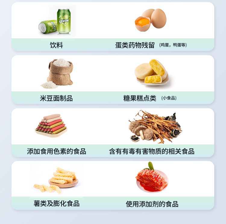 | 食品添加劑:二氧化硫、雙氧水、亞硝酸鹽、硝酸鹽、苯甲酸鈉、山梨酸鉀、糖精鈉、甜蜜素、木耳硫酸鎂等 | 有毒有害物質(zhì):甲醛、吊白塊、硼砂、過氧化苯甲酰、溴酸鉀、羅丹明B、三聚氰胺、蘇丹紅、工業(yè)堿、尿素、明礬等 | 果蔬:農(nóng)藥殘留(酶抑制率法) | 病害肉:組胺、揮發(fā)性鹽基氮 | 重金屬含量:鉛、鎘、鉻、汞、砷、錫、鎳、鋁等 | 水酒飲品分析:酒中甲醇、乙醇、乳品及牛奶中蛋白質(zhì) | 調(diào)味品成分: 食醋的總酸、醬油的總酸、芝麻油純度、谷氨酸鈉、醬油氨基酸態(tài)氮、食鹽中亞鐵氰化鉀、食鹽中碘等 | 食用色素類:紅色色素(胭脂紅、莧菜紅、莧菜紅)、黃色色素(檸檬黃、日落黃)、藍色色素(亮藍)等 | 蜂蜜成分:果糖和葡萄糖、蔗糖、淀粉酶、酸度等 | 食用油脂:過氧化值、酸價等 |