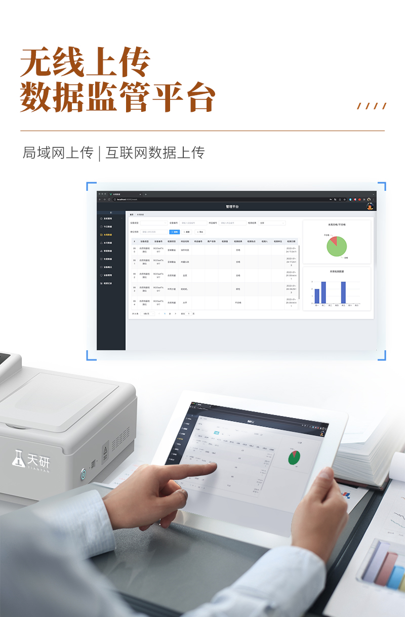 | 儀器采用手提一體化系統(tǒng)檢測技術,將分光光度模塊、膠體金檢測模塊、新型農(nóng)殘檢測模塊、數(shù)字化管理模塊、無線通訊模塊高度集成于一體,支持檢測200種食品安全檢測項目,同時預留升級檢測方法。 | 儀器檢測模塊標準化、智能化,檢測項目可隨意自由組合。檢測箱體內(nèi)置多個標準檢測單元,檢測模塊可以調(diào)整配置。 | 顯示屏幕:儀器采用10.1英寸豎向液晶觸摸屏顯,搭配運行安卓智能操作系統(tǒng),主控芯片采用ARM Cortex-A7,RK3288/4核處理器,主頻1.88Ghz,操作方便,性能更強。 | 檢測通道:≥12通道;采用精密旋轉(zhuǎn)比色池設計,使用同芯片同光源校準精度,解決不同光源之間的誤差值,更加準確**。(1-12通道間誤差0.1%,**號:ZL202022821055.2) | 儀器光源:高精度進口四波長冷光源,每個通道均配置 410、520、590、630nm 波長光源,標配**的光路切換裝置,**光路切換功能可實現(xiàn)64波長,并且所有檢測項目可實現(xiàn)所有通道同時檢測。 | 設備可一鍵校準,自動保存校準數(shù)據(jù),自動對比校驗,得到精準光源,采用Android SP存儲數(shù)據(jù),光源數(shù)據(jù)永不丟失,方便每一次使用。 | 通訊接口:配備無線通信模塊、4G(APN)通訊模塊、藍牙傳輸,同時具有雙USB接口以及RJ45網(wǎng)線接口,可以多方式實現(xiàn)數(shù)據(jù)保存及數(shù)據(jù)傳輸。 | 存儲方式:支持U盤存儲,標準USB接口,免驅(qū)動安裝。檢測結果存儲容量20萬條以上,可生成Excel表格進行拷貝,并具有登錄保護功能。 | 智能化操作系統(tǒng):: ★操作系統(tǒng):儀器可在同一檢測界面自動對應相關檢測通道,一次性選擇1-12個樣品名稱,無需退出界面,節(jié)省操作時間。并可以對每個通道屬性和樣品信息單獨進行編輯,例如送檢單位、人員,檢測人員等,打印時勾選打印顯示。 | ★數(shù)據(jù)集成系統(tǒng):設備首頁自動匯總分析檢測數(shù)據(jù),包含:周檢測數(shù)據(jù)、月檢測數(shù)據(jù),全部檢測總數(shù)量,均包含檢測總數(shù),合格數(shù),不合格數(shù),以及相關柱形分析圖,各項檢測數(shù)據(jù)一目了然,無需電腦查詢,更加快捷直觀。 | ★數(shù)據(jù)庫系統(tǒng):十幾項數(shù)據(jù)庫分類管理儀器:包含項目類型、項目數(shù)據(jù)、檢測數(shù)據(jù)、歷史記錄、國標信息、曲線信息、采樣信息、檢測信息、受檢信息、復核信息、圖表信息、光源校準信息、打印樣式信息、樣品庫信息等等,數(shù)據(jù)庫之間互相協(xié)調(diào)聯(lián)動保證數(shù)據(jù)的真實完整性。同時產(chǎn)品數(shù)據(jù)庫以及歷史檢測記錄支持一鍵檢索功能。 | ★限量規(guī)判系統(tǒng):具有限量查詢、添加物質(zhì)合規(guī)判定系統(tǒng)。檢測出結果后,系統(tǒng)自動調(diào)用系統(tǒng)數(shù)據(jù)庫中相關國標進行比對判定,客觀顯示判定結果是否合格 | ★項目預設系統(tǒng):儀器具有任務預設模塊,一鍵提前預設,給出方便快捷的新檢測方案,每一個任務分別可以設置不同的樣品、批次、編號、來源、備注、抽樣信息、檢測信息、受檢信息、復核信息等更多信息。樣品送檢時一鍵調(diào)取保存信息,并可多次調(diào)取,大大提高檢測效率。 | ★數(shù)據(jù)監(jiān)管系統(tǒng):同步對接監(jiān)管平臺,數(shù)據(jù)可局域網(wǎng)和互聯(lián)網(wǎng)數(shù)據(jù)上傳,檢測結果可選擇直接傳至食品安全監(jiān)管平臺。進行區(qū)域食品安全監(jiān)管及大數(shù)據(jù)分析處理與數(shù)據(jù)統(tǒng)計,檢測區(qū)域食品安全長短期動態(tài),達到食品安全問題預估、預警。 | ★打印系統(tǒng):內(nèi)置全新打印機,新創(chuàng)自定義打印方式,可按需靈活勾選控制:產(chǎn)品合格證(國家農(nóng)業(yè)部標準要求),二維碼,抽樣信息、檢測信息,受檢信息、復核信息、抽樣日期、檢測日期等信息的打印。 | 供電模式:儀器交直流兩用,直流12V供電,可連接車載電源,可配6ah大容量充電鋰電池,電量可實時顯示,方便戶外流動測試。 | 膠體金檢測模塊:采用雙通道CMOS成像處理技術及膠體金免疫層析技術,可同時讀取雙膠體金卡數(shù)據(jù),自動采集、處理分析,將檢測結果顯示,并可根據(jù)參考限值自動判斷檢測結果,可檢測常見的獸藥殘留、生物毒素、抗生素、違禁添加物等。 | ★探測技術:CMOS成像探測; | ★檢測通道:1個通道; | ★檢測方式:消線法和比色法; | ★顯示模式:陰性或陽性; | 曲線形式:軌道式掃描方式,顯示金標卡圖像,實時生成、識別CT曲線圖,無需手動調(diào)整,完成檢測后自動退出檢測卡。兼容市場上其他金標卡,使用耗材不受限制。 | 儀器具備遠程升級功能,可定向分客戶分儀器更新,開機后自動更新,并可持續(xù)性免費更新系統(tǒng)版本,無需像傳統(tǒng)產(chǎn)品返廠更新,節(jié)省時間及人力成本并避免了物流運輸返廠升級導致設備損壞的潛在風險。 |