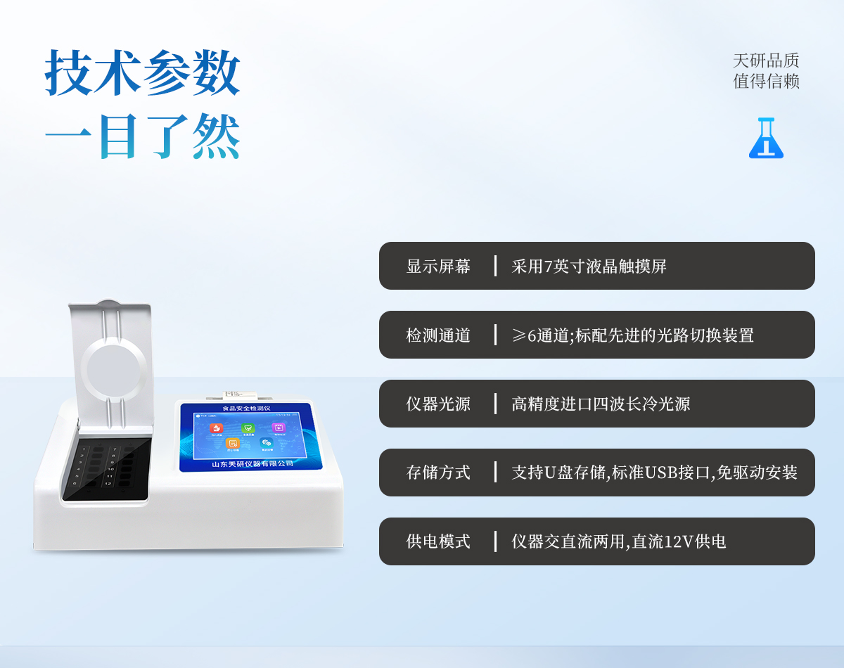 產(chǎn)品描述:產(chǎn)品介紹: 多功能食品安全檢測(cè)儀可快速檢測(cè)200多項(xiàng)目,包含非食用化學(xué)物質(zhì)、濫用食品添加劑、農(nóng)藥殘留、獸藥殘留、重金屬、病害肉、營養(yǎng)強(qiáng)化劑、抗生素類殘留、激素類殘留、真菌毒素類殘留、化學(xué)類殘留等現(xiàn)場(chǎng)的定性定量檢測(cè)。該多功能食品安全檢測(cè)儀為集成化食品安全快速檢測(cè)分析設(shè)備,廣泛應(yīng)用于市場(chǎng)【詳情】