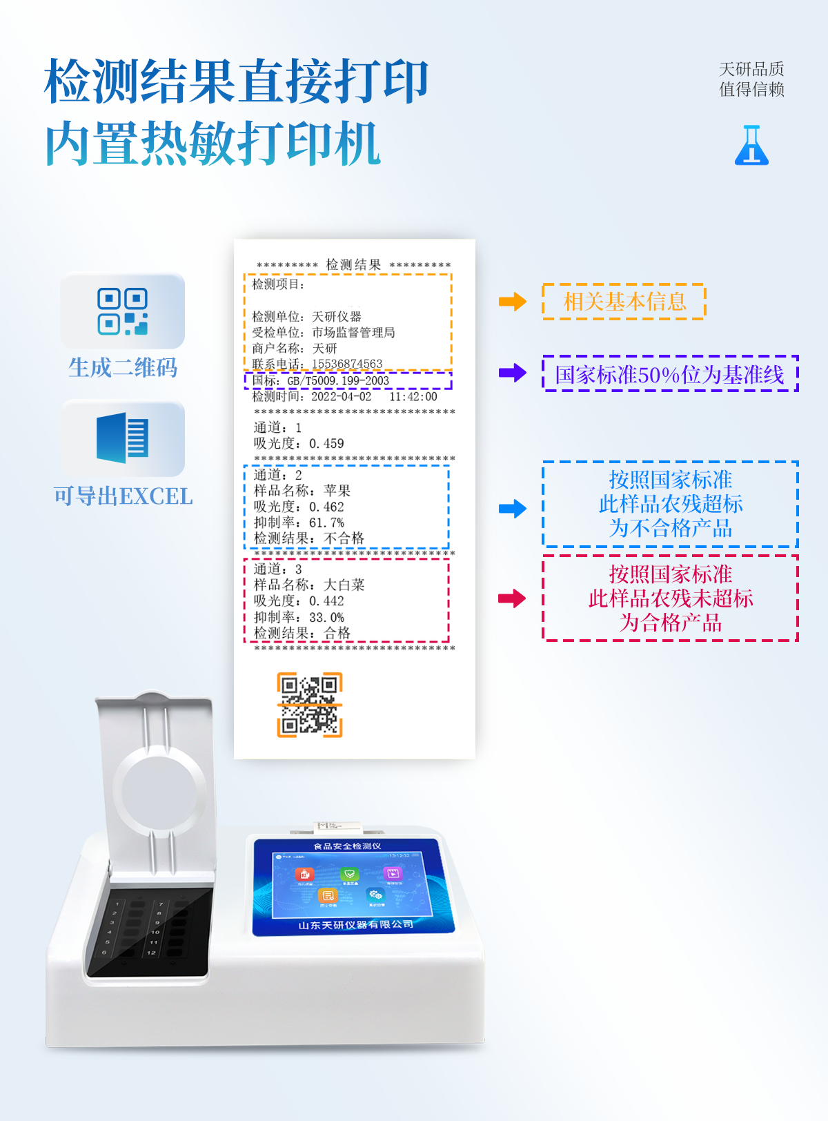| 安卓智能操作系統(tǒng),采用更加**和人性化操作,儀器具有網(wǎng)線連接、wifi聯(lián)網(wǎng)上傳、GPRS無線遠(yuǎn)傳功能,快速上傳數(shù)據(jù)。 | 智能化程度高,儀器具有自檢功能:具有開機(jī)自檢和調(diào)零功能,具有自動(dòng)檢測(cè)重復(fù)性功能。 | 檢測(cè)通道:≥12個(gè)檢測(cè)通道,可以同時(shí)測(cè)試多個(gè)樣品,每個(gè)樣品由程序控制分別獨(dú)立工作,不會(huì)互相干擾。 | 顯示方式:≥8英寸液晶觸摸屏顯示,人性化中文操作界面,讀數(shù)直觀、簡(jiǎn)單。 | 配備新一代嵌入式熱敏打印機(jī),可選擇手動(dòng)打印或者自動(dòng)打印,檢測(cè)完成可自動(dòng)打印檢測(cè)報(bào)告和二維碼。 | 光源采用進(jìn)口超高亮發(fā)光二極管,高精度、穩(wěn)定性強(qiáng)、光源可控、可以關(guān)掉不使用的光源,功耗更低。 | 采用USB2.0接口設(shè)計(jì),方便數(shù)據(jù)的存貯和移動(dòng),并可隨時(shí)與計(jì)算機(jī)直接相連,并且可用計(jì)算機(jī)控制儀器。實(shí)現(xiàn)數(shù)據(jù)查詢、瀏覽、分析、統(tǒng)計(jì)、打印等。 | 儀器帶有監(jiān)管平臺(tái)。數(shù)據(jù)可局域網(wǎng)和互聯(lián)網(wǎng)數(shù)據(jù)上傳,檢測(cè)結(jié)果直接傳至食品安全監(jiān)管平臺(tái)。進(jìn)行區(qū)域食品安全監(jiān)管及大數(shù)據(jù)分析處理,檢測(cè)區(qū)域食品安全長短期動(dòng)態(tài),達(dá)到食品安全問題預(yù)估、預(yù)警 | 一體化便攜式快檢設(shè)備,滿足現(xiàn)場(chǎng)及流動(dòng)檢測(cè)使用需求,能夠在同一軟件下實(shí)現(xiàn)所有檢測(cè)項(xiàng)目的檢測(cè),并可通過同一窗口直觀顯示檢測(cè)結(jié)果。 | 儀器具有多品類多種類樣品菜單庫,可靈活選擇檢測(cè)樣品,不同的檢測(cè)通道可同時(shí)檢測(cè)不同的樣品項(xiàng)目。也可在儀器上直接編輯錄入樣品名稱、檢測(cè)指標(biāo)、送檢單位等信息并保存進(jìn)樣品數(shù)據(jù)庫。 | 樣品處理簡(jiǎn)單省力,整體操作快速、安全、便捷。 | 儀器具有自身保護(hù)功能,可設(shè)置用戶名及密碼,防止非工作人員操作等。 | 高靈敏度,高檢測(cè)精度,高重復(fù)性精度,掃描式高精度光學(xué)傳感器。 | 儀器具有重新校準(zhǔn)、鎖定、恢復(fù)出廠設(shè)置功能。 | 支持U盤存儲(chǔ)。 結(jié)果判定線可修改,對(duì)照值標(biāo)定值可保存,斷電不丟失數(shù)據(jù)。 |