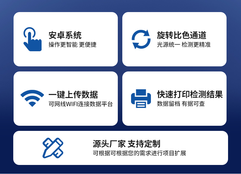 | 機(jī)器采用全新安卓智能系統(tǒng),主控芯片采用 ARM Cortex-A7,RK3288/4核處理器,主頻1.88Ghz,運(yùn)轉(zhuǎn)速度更快速,穩(wěn)定性更強(qiáng)。 | 創(chuàng)新檢測(cè)模式: *儀器采用精密旋轉(zhuǎn)比色池設(shè)計(jì),使用光源一致,可以解決各通道間由于光源誤差帶來的檢測(cè)結(jié)果誤差問題,檢測(cè)結(jié)果更加精準(zhǔn)。 *儀器具有自動(dòng)識(shí)別比色皿檢測(cè)功能,即:將樣品比色皿放入儀器后,點(diǎn)擊樣品檢測(cè),儀器自動(dòng)識(shí)別比色皿進(jìn)行通道檢測(cè)。 | 供電方式:交直流兩用,直流 12V 供電,可連接車載電源,可配 6ah 大容量充電鋰電池,方便戶外流動(dòng)測(cè)試。 | 顯示方式:7英寸液晶觸摸屏顯示,人性化中文操作界面,讀數(shù)直觀、簡(jiǎn)單。 | 檢測(cè)通道:8個(gè)檢測(cè)通道,可以同時(shí)測(cè)試多個(gè)樣品,循環(huán)檢測(cè),即放即檢,每個(gè)樣品由程序控制分別獨(dú)立工作,不會(huì)互相干擾。 | 高精光源系統(tǒng): ①儀器光源采用進(jìn)口超高亮發(fā)光二極管,光源亮度可以自動(dòng)調(diào)節(jié)與校準(zhǔn) ②智能恒流穩(wěn)壓,光強(qiáng)自動(dòng)校準(zhǔn),長(zhǎng)時(shí)間連續(xù)工作光源無溫漂現(xiàn)象。 | 智能操作分析系統(tǒng): ①儀器具有100多種蔬菜名稱菜單庫(kù),分類管理,并可按需添加或刪除、編輯蔬菜名稱;可在同一檢測(cè)界面自動(dòng)對(duì)應(yīng)相關(guān)檢測(cè)通道一次性選擇1-24個(gè)樣品名稱,無需退出界面,節(jié)省操作時(shí)間。 ②內(nèi)置新國(guó)家限量標(biāo)準(zhǔn),與所測(cè)結(jié)果進(jìn)行現(xiàn)場(chǎng)比對(duì),并持續(xù)更新標(biāo)準(zhǔn)。 | 完善的配套硬件: ①采用串口5v打印機(jī),可選擇手動(dòng)打印或者自動(dòng)打印,三分鐘出打印結(jié)果,打印格式為檢測(cè)人姓名、吸光度差值、檢測(cè)時(shí)間、檢測(cè)機(jī)構(gòu)、樣品名稱及結(jié)果判定。 ②儀器具有無線上傳模塊,檢測(cè)結(jié)果可批量打印,批量上傳。 | 數(shù)據(jù)調(diào)用: ①儀器可存儲(chǔ)20萬條檢測(cè)結(jié)果, ②檢測(cè)結(jié)果為Excel表格,方便后期進(jìn)行數(shù)據(jù)分析與匯總報(bào)告 ③儀器采用USB2.0接口設(shè)計(jì),支持 U 盤存儲(chǔ),方便數(shù)據(jù)的存貯和移動(dòng),并可隨時(shí)與計(jì)算機(jī)直接相連,實(shí)現(xiàn)數(shù)據(jù)查詢、瀏覽、分析、統(tǒng)計(jì)、打印等。 | 后期產(chǎn)品固件可升級(jí)。 | 安全證書,放心保障:儀器具有中國(guó)計(jì)量科學(xué)研究院校準(zhǔn)證書,**認(rèn)證,使用放心。 | 機(jī)箱采用工業(yè)級(jí)ABS工程塑料箱,方便攜帶,穩(wěn)固耐用,便于流動(dòng)測(cè)試。 |