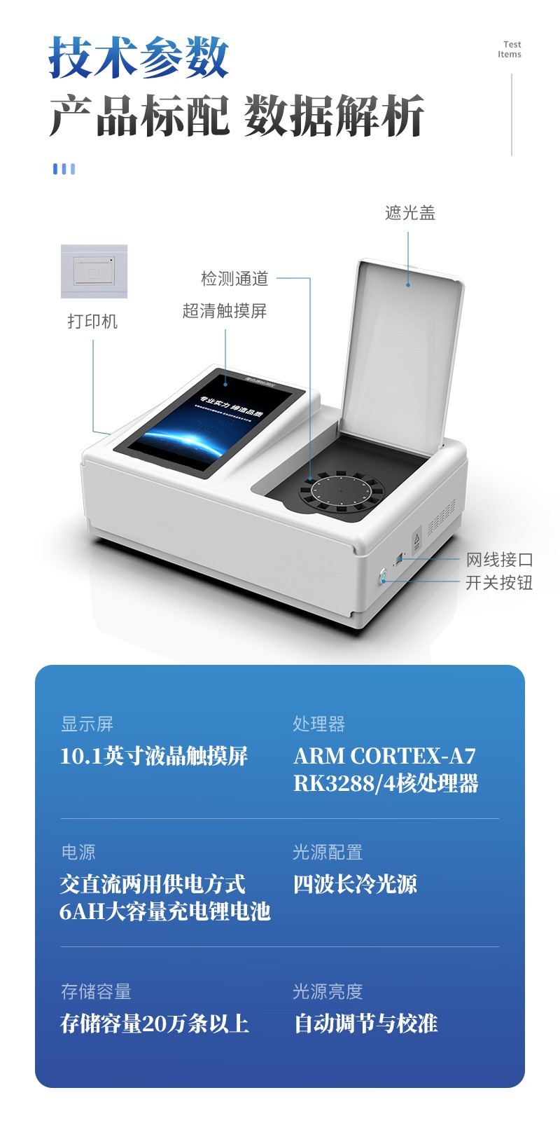 | 儀器采用臺(tái)式一體化系統(tǒng)檢測(cè)技術(shù),將分光光度模塊、新型農(nóng)殘檢測(cè)模塊、數(shù)字化管理模塊、無線通訊模塊高度集成于一體,支持檢測(cè)200種食品安全檢測(cè)項(xiàng)目,同時(shí)預(yù)留升級(jí)檢測(cè)方法。 | 儀器檢測(cè)模塊標(biāo)準(zhǔn)化、智能化,可隨意自由組合。檢測(cè)箱體內(nèi)置多個(gè)標(biāo)準(zhǔn)檢測(cè)單元,檢測(cè)模塊可以調(diào)整配置。 | 儀器采用全新安卓智能系統(tǒng),主控芯片采用 ARM Cortex-A7,RK3288/4核處理器,10.1寸高清液晶觸摸豎屏,更加**的UI交互界面,運(yùn)轉(zhuǎn)快捷;儀器配備無線通信模塊: 4G(APN)通訊模塊、Wifi模塊,藍(lán)牙傳輸,同時(shí)具有雙USB接口以及RJ45接口能以多種方式實(shí)現(xiàn)數(shù)據(jù)保存和數(shù)據(jù)傳輸功能。 | 創(chuàng)新檢測(cè)模式: | ★檢測(cè)通道:≥12通道;采用精密旋轉(zhuǎn)比色池設(shè)計(jì),使用同芯片同光源校準(zhǔn)精度,解決不同光源之間的誤差值。1-12通道間誤差0.1%。(**號(hào):ZL202022821055.2) | ★儀器具有自動(dòng)識(shí)別比色皿檢測(cè)功能,即:將樣品比色皿放入儀器后,點(diǎn)擊樣品檢測(cè),儀器自動(dòng)識(shí)別比色皿進(jìn)行通道檢測(cè)。 | 進(jìn)口高精光源: | 高精度進(jìn)口四波長(zhǎng)冷光源,通道配置 410、520、590、630nm 波長(zhǎng)光源,一個(gè)光源芯片驅(qū)動(dòng)一個(gè)光源,誤差極小,每臺(tái)設(shè)備單獨(dú)**校準(zhǔn)光源,**比對(duì),同時(shí)參照四種不同波段光源全方位覆蓋市面上99%的農(nóng)殘食品項(xiàng)目檢測(cè)。 | 智能化操作系統(tǒng): | 便捷操作系統(tǒng):設(shè)備檢測(cè)時(shí)可在同一檢測(cè)界面自動(dòng)對(duì)應(yīng)相關(guān)檢測(cè)通道一次性選擇1-12個(gè)樣品名稱,無須退出界面,節(jié)省操作時(shí)間。 | 數(shù)據(jù)集成系統(tǒng):設(shè)備首頁(yè)自動(dòng)統(tǒng)計(jì)檢測(cè)數(shù)據(jù)包含:周檢測(cè)數(shù)據(jù)、月檢測(cè)數(shù)據(jù),全部檢測(cè)總數(shù)量,均包含檢測(cè)總數(shù),合格數(shù),不合格數(shù),以及相關(guān)柱形分析圖,對(duì)各項(xiàng)檢測(cè)數(shù)據(jù)清晰掌握,無需電腦查詢,更加快捷直觀。 | 項(xiàng)目預(yù)設(shè)系統(tǒng):支持添加單個(gè)及多個(gè)相同或不相同的任務(wù)預(yù)設(shè),一鍵快速調(diào)取,每一個(gè)任務(wù)分別可以設(shè)置不同的樣品、批次、編號(hào)、來源、備注、抽樣信息、檢測(cè)信息、受檢信息、復(fù)核信息等更多信息。無縫鏈接平臺(tái)和APP實(shí)時(shí)查看下發(fā)任務(wù)。 | 數(shù)據(jù)監(jiān)管系統(tǒng):同步對(duì)接監(jiān)管平臺(tái),數(shù)據(jù)可局域網(wǎng)和互聯(lián)網(wǎng)數(shù)據(jù)上傳,檢測(cè)結(jié)果可選擇直接傳至食品安全監(jiān)管平臺(tái)。集成OSS輸出存儲(chǔ)服務(wù)、區(qū)分設(shè)備定向管理應(yīng)用,進(jìn)行區(qū)域食品安全監(jiān)管及大數(shù)據(jù)分析處理與數(shù)據(jù)統(tǒng)計(jì),檢測(cè)區(qū)域食品安全長(zhǎng)短期動(dòng)態(tài),達(dá)到食品安全問題預(yù)估、預(yù)警。 | 自定義打印系統(tǒng):內(nèi)置全新打印系統(tǒng),新創(chuàng)自定義打印方式,可按需靈活設(shè)置開啟或關(guān)閉:產(chǎn)品合格證(國(guó)家農(nóng)業(yè)部標(biāo)準(zhǔn)要求),二維碼,抽樣信息、檢測(cè)信息,受檢信息、復(fù)核信息、抽樣日期、檢測(cè)日期等信息的打印。 | 系統(tǒng)遠(yuǎn)程更新功能:可定向分客戶分儀器更新系統(tǒng),按照不同客戶后期實(shí)際需求添加項(xiàng)目,無需機(jī)器返廠,即可遠(yuǎn)程實(shí)時(shí)升級(jí)全新系統(tǒng),節(jié)省時(shí)間成本及避免運(yùn)輸造成設(shè)備損壞。 | 儀器主機(jī)采用一體化防水、抗壓、防撞擊、防腐蝕箱體設(shè)計(jì),同時(shí)配備交直流供電,可連接車載電源,可選配大容量充電鋰電池,滿足現(xiàn)場(chǎng)野外檢測(cè)需求。 | 安全證書,放心保障:儀器具有中國(guó)計(jì)量科學(xué)研究院校準(zhǔn)證書,**認(rèn)證。 |