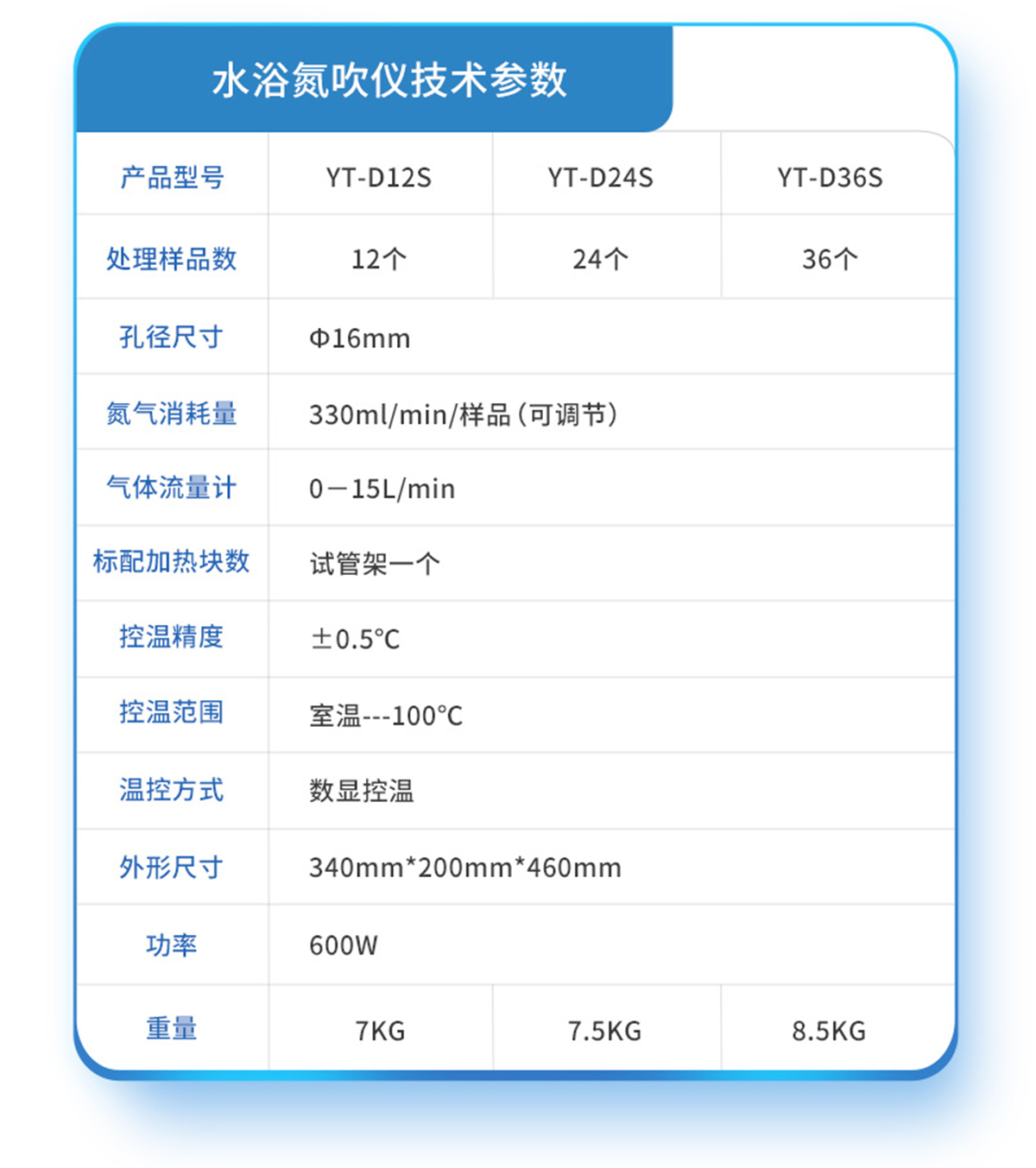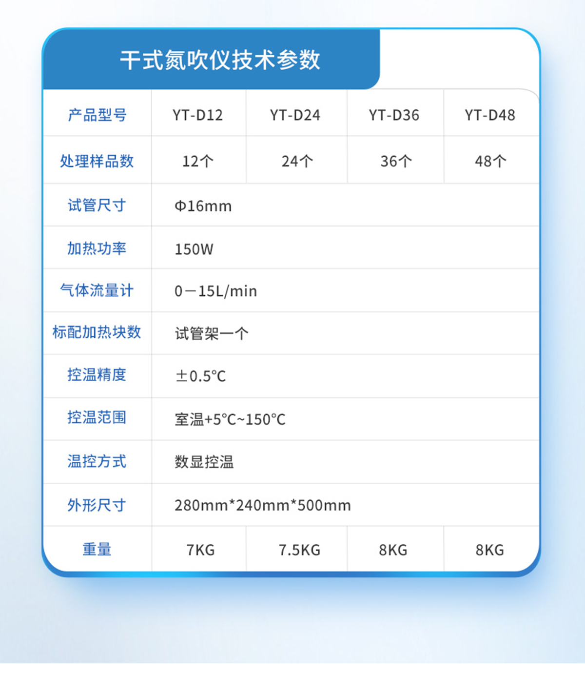 | YT-D12(12孔) | 12個 | Ф16mm | 150W | 0-15L/min | 試管架一個 | ±0.5℃ | 室溫+5℃~150℃ | 數(shù)顯控溫 | 280mm*240mm*500mm | 7KG |
