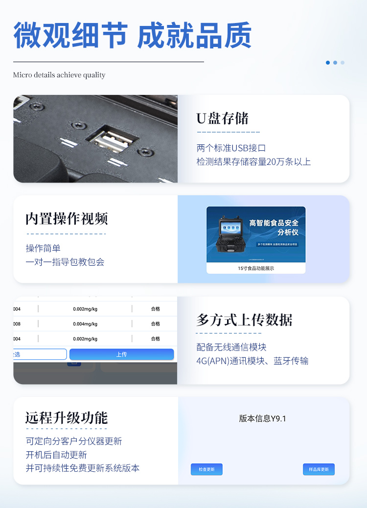 | 儀器采用臺式一體化系統(tǒng)檢測技術(shù),將分光光度模塊、新型農(nóng)殘檢測模塊、數(shù)字化管理模塊、無線通訊模塊高度集成于一體,支持檢測200種食品安全檢測項目,同時預(yù)留升級檢測方法。 | 儀器檢測模塊標(biāo)準(zhǔn)化、智能化,可隨意自由組合。檢測箱體內(nèi)置多個標(biāo)準(zhǔn)檢測單元,檢測模塊可以調(diào)整配置。 | 儀器采用全新安卓智能系統(tǒng),主控芯片采用 ARM Cortex-A7,RK3288/4核處理器,10.1寸高清液晶觸摸豎屏,更加**的UI交互界面,運轉(zhuǎn)快捷;儀器配備無線通信模塊: 4G(APN)通訊模塊、Wifi模塊,藍(lán)牙傳輸,同時具有雙USB接口以及RJ45接口能以多種方式實現(xiàn)數(shù)據(jù)保存和數(shù)據(jù)傳輸功能。 | 創(chuàng)新檢測模式: | ★檢測通道:≥12通道;采用精密旋轉(zhuǎn)比色池設(shè)計,使用同芯片同光源校準(zhǔn)精度,解決不同光源之間的誤差值。1-12通道間誤差0.1%。(**號:ZL202022821055.2) | ★儀器具有自動識別比色皿檢測功能,即:將樣品比色皿放入儀器后,點擊樣品檢測,儀器自動識別比色皿進(jìn)行通道檢測。 | 進(jìn)口高精光源: | 高精度進(jìn)口四波長冷光源,通道配置 410、520、590、630nm 波長光源,一個光源芯片驅(qū)動一個光源,誤差極小,每臺設(shè)備單獨**校準(zhǔn)光源,**比對,同時參照四種不同波段光源全方位覆蓋市面上99%的農(nóng)殘食品項目檢測。 | 智能化操作系統(tǒng): | 便捷操作系統(tǒng):設(shè)備檢測時可在同一檢測界面自動對應(yīng)相關(guān)檢測通道一次性選擇1-12個樣品名稱,無須退出界面,節(jié)省操作時間。 | 數(shù)據(jù)集成系統(tǒng):設(shè)備首頁自動統(tǒng)計檢測數(shù)據(jù)包含:周檢測數(shù)據(jù)、月檢測數(shù)據(jù),全部檢測總數(shù)量,均包含檢測總數(shù),合格數(shù),不合格數(shù),以及相關(guān)柱形分析圖,對各項檢測數(shù)據(jù)清晰掌握,無需電腦查詢,更加快捷直觀。 | 項目預(yù)設(shè)系統(tǒng):支持添加單個及多個相同或不相同的任務(wù)預(yù)設(shè),一鍵快速調(diào)取,每一個任務(wù)分別可以設(shè)置不同的樣品、批次、編號、來源、備注、抽樣信息、檢測信息、受檢信息、復(fù)核信息等更多信息。無縫鏈接平臺和APP實時查看下發(fā)任務(wù)。 | 數(shù)據(jù)監(jiān)管系統(tǒng):同步對接監(jiān)管平臺,數(shù)據(jù)可局域網(wǎng)和互聯(lián)網(wǎng)數(shù)據(jù)上傳,檢測結(jié)果可選擇直接傳至食品安全監(jiān)管平臺。集成OSS輸出存儲服務(wù)、區(qū)分設(shè)備定向管理應(yīng)用,進(jìn)行區(qū)域食品安全監(jiān)管及大數(shù)據(jù)分析處理與數(shù)據(jù)統(tǒng)計,檢測區(qū)域食品安全長短期動態(tài),達(dá)到食品安全問題預(yù)估、預(yù)警。 | 自定義打印系統(tǒng):內(nèi)置全新打印系統(tǒng),新創(chuàng)自定義打印方式,可按需靈活設(shè)置開啟或關(guān)閉:產(chǎn)品合格證(國家農(nóng)業(yè)部標(biāo)準(zhǔn)要求),二維碼,抽樣信息、檢測信息,受檢信息、復(fù)核信息、抽樣日期、檢測日期等信息的打印。 | 系統(tǒng)遠(yuǎn)程更新功能:可定向分客戶分儀器更新系統(tǒng),按照不同客戶后期實際需求添加項目,無需機器返廠,即可遠(yuǎn)程實時升級全新系統(tǒng),節(jié)省時間成本及避免運輸造成設(shè)備損壞。 | 儀器主機采用一體化防水、抗壓、防撞擊、防腐蝕箱體設(shè)計,同時配備交直流供電,可連接車載電源,可選配大容量充電鋰電池,滿足現(xiàn)場野外檢測需求。 | 安全證書,放心保障:儀器具有中國計量科學(xué)研究院校準(zhǔn)證書,**認(rèn)證。 |