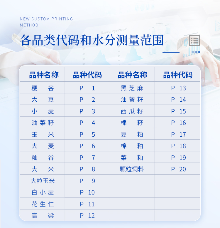 | 測(cè)量范圍:可測(cè)量谷類(lèi)、玉米、東北玉米、大麥、小麥、白小麥、大米、豆粕、花生仁、菜粕、高粱、黑芝麻、棉籽、棉粕、秈谷、大豆、油菜籽、飼料、蔬菜種子等非金屬顆粒狀物質(zhì)。 | 快速準(zhǔn)確:數(shù)秒內(nèi)即可顯示結(jié)果,測(cè)量誤差≤±0.5℅ | 操作簡(jiǎn)單:20個(gè)常見(jiàn)品種已預(yù)先定標(biāo),不需秤樣、用料簡(jiǎn)取樣后可立即測(cè)量水分 | 水分測(cè)量范圍:3-35℅ | 使用環(huán)境溫度:0~40℃ | 溫度補(bǔ)償:自動(dòng) | 定 標(biāo):浮動(dòng)四點(diǎn)定標(biāo),品種不限(常見(jiàn)品種20個(gè)已預(yù)先定標(biāo),可直接測(cè)量) | 工作電源:直流6V(5號(hào)干電池四節(jié)) | 自動(dòng)關(guān)機(jī):超過(guò)三分鐘無(wú)操作自動(dòng)關(guān)機(jī)。 | 便攜方便:重約1千克、外型小巧、電源交直流二用,適合各種工作場(chǎng)合 | 適合國(guó)情:用戶可對(duì)本地特殊品種采用本機(jī)獨(dú)創(chuàng)的四點(diǎn)定標(biāo)法自行定標(biāo),自行修正水分值 | 高性價(jià)比:技術(shù)含量高,性能**而價(jià)格相比同類(lèi)產(chǎn)品較低。 |