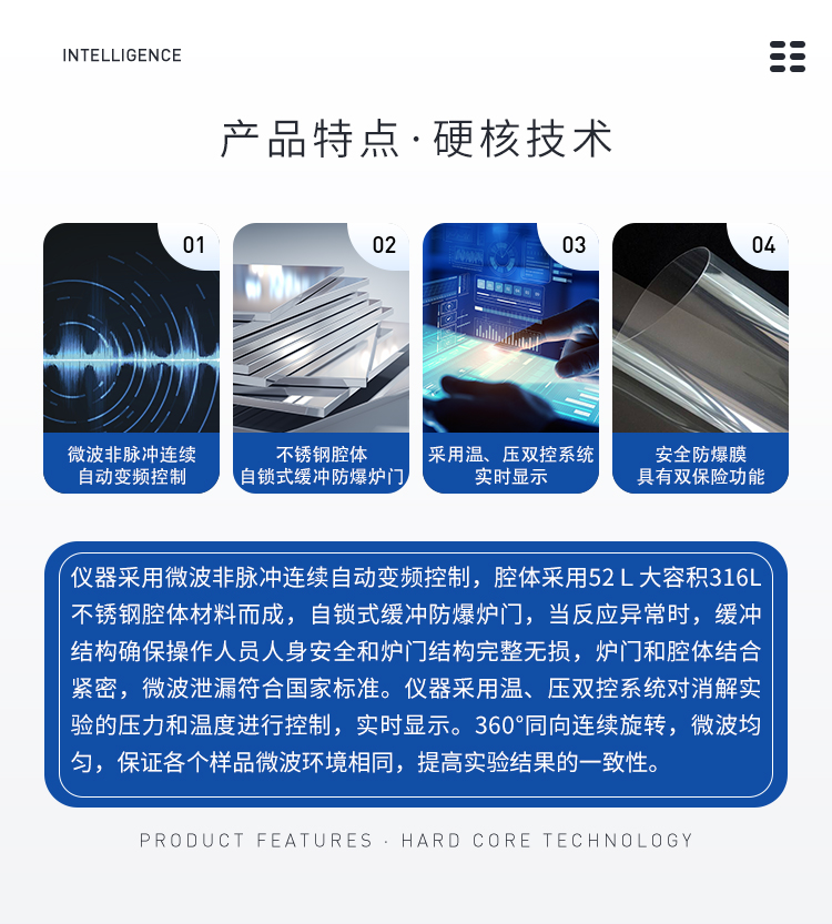 儀器采用微波非脈沖連續(xù)自動(dòng)變頻控制,延長了儀器的使用壽命和電磁波的均勻性,腔體采用52L大容積316L不銹鋼腔體材料制成,自鎖式緩沖防爆爐門,當(dāng)反應(yīng)異常時(shí),緩沖結(jié)構(gòu)確保操作人員人身安全和爐門結(jié)構(gòu)完整無損,爐門和腔體結(jié)合緊密,微波泄漏符合國家標(biāo)準(zhǔn)。儀器采用溫、壓雙控系統(tǒng)對(duì)消解實(shí)驗(yàn)的壓力和溫度進(jìn)行控制,實(shí)時(shí)顯示。360°同向連續(xù)旋轉(zhuǎn),微波均勻,確定各個(gè)樣品微波環(huán)境相同,提高實(shí)驗(yàn)結(jié)果的一致性。當(dāng)罐內(nèi)的壓力超過設(shè)定的保護(hù)值時(shí),微波會(huì)自動(dòng)停止加熱。安全防爆膜具有雙保險(xiǎn)功能,當(dāng)罐內(nèi)的壓力超過防爆膜所能承受的壓力時(shí),防爆膜先行破裂,氣體瀉出,防止罐體受損和對(duì)人體的傷害。
