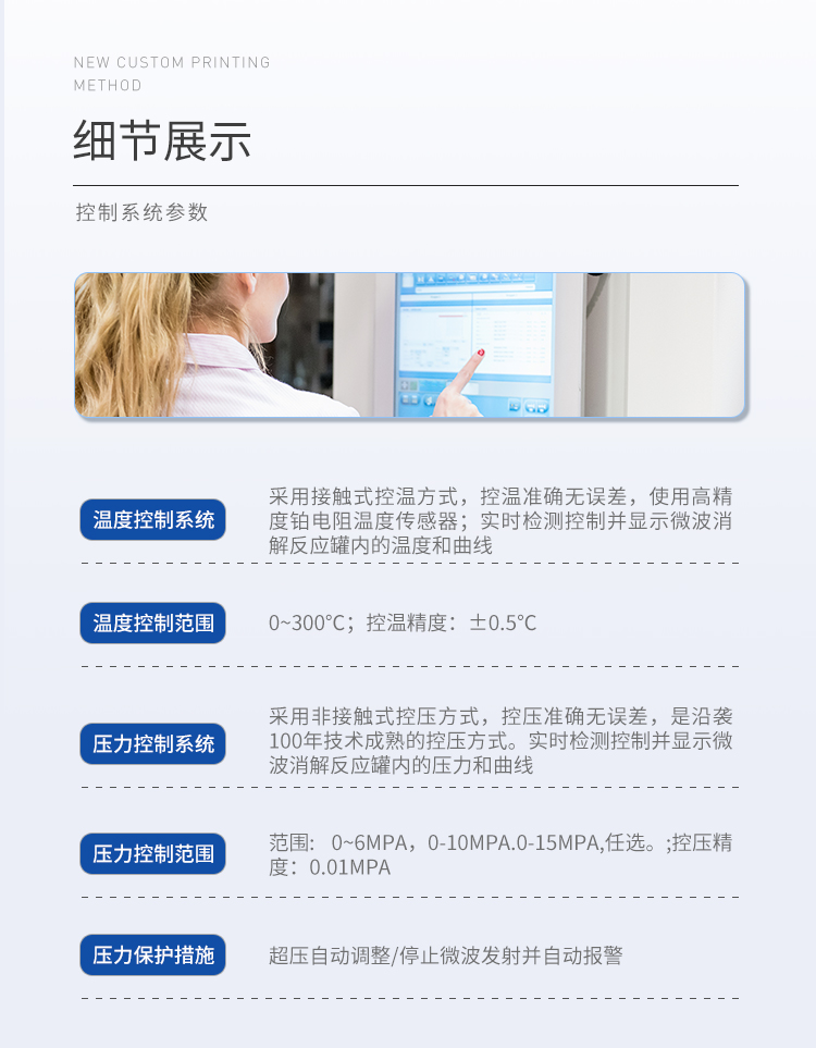 | (1)溫度控制系統(tǒng):采用接觸式控溫方式,控溫準(zhǔn)確無誤差,使用高精度鉑電阻溫度傳感器;實(shí)時(shí)檢測控制并顯示微波消解反應(yīng)罐內(nèi)的溫度和曲線; | (2)溫度控制范圍:0~300℃;控溫精度:±0.5℃; | (3)控溫能力:速率升溫功能。 | (4)壓力控制系統(tǒng):采用非接觸式控壓方式,控壓準(zhǔn)確無誤差,是沿襲100年技術(shù)成熟的控壓方式。實(shí)時(shí)檢測控制并顯示微波消解反應(yīng)罐內(nèi)的壓力和曲線; | (5)壓力控制范圍:范圍: 0~6MPa,0-10MPa.0-15MPa,任選。;控壓精度:0.01MPa; | (6)壓力保護(hù):超壓自動(dòng)調(diào)整/停止微波發(fā)射并自動(dòng)報(bào)警; |