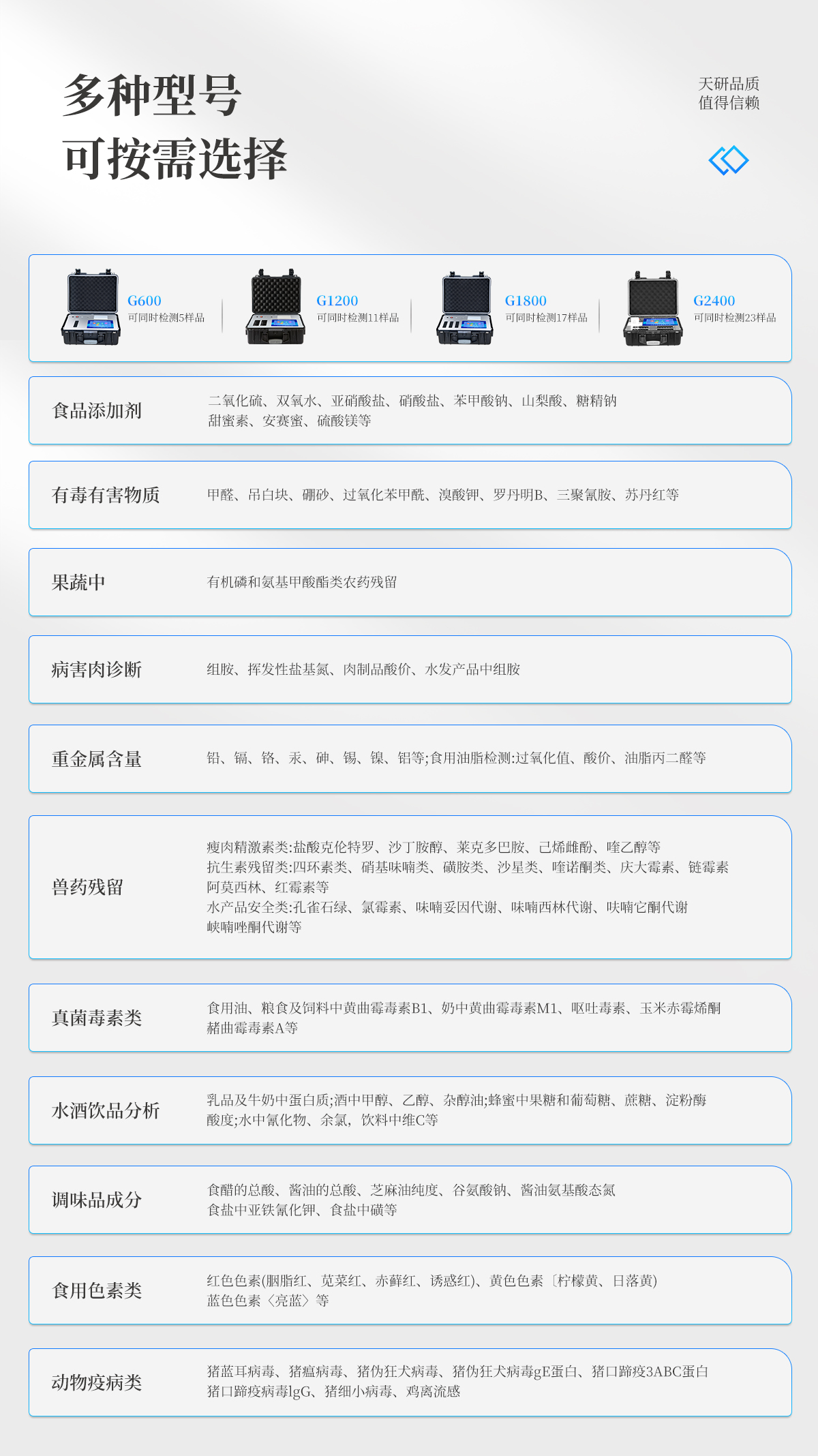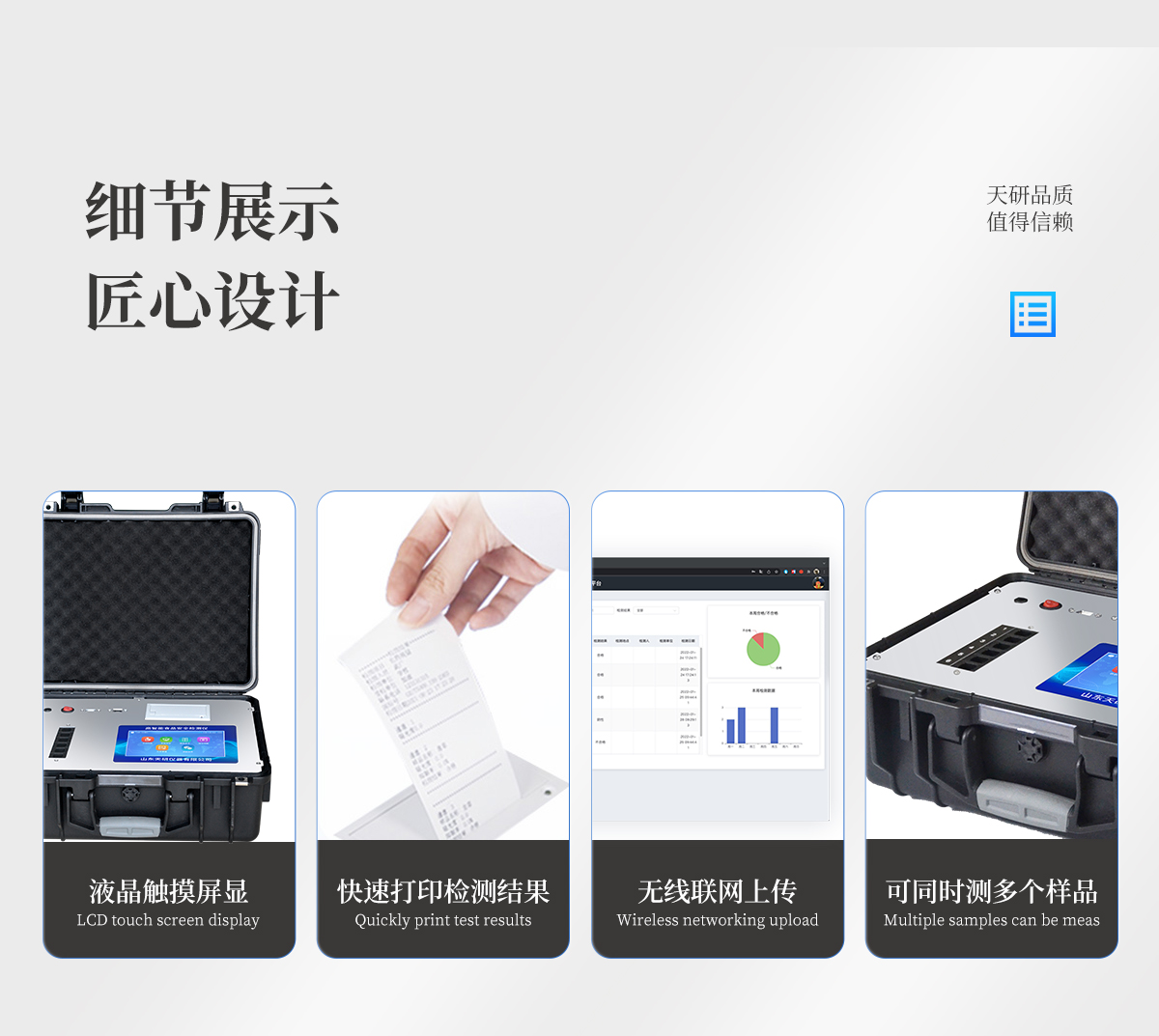 | 儀器采用手提式一體化系統(tǒng)檢測技術,將分光光度模塊、新型農(nóng)殘檢測模塊、數(shù)字化管理模塊、無線通訊模塊高度集成于一體,支持檢測200種食品安全檢測項目,同時預留升級檢測方法。 | 儀器檢測模塊標準化、智能化,檢測項目可隨意自由組合。檢測箱體內(nèi)置多個標準檢測單元,檢測模塊可以調(diào)整配置。 | 顯示屏幕:儀器采用10.1英寸豎向液晶觸摸屏顯,搭配運行安卓智能操作系統(tǒng),主控芯片采用ARM Cortex-A7,RK3288/4核處理器,主頻1.88Ghz,操作方便,性能更強。 | 檢測通道:≥12通道;采用精密旋轉(zhuǎn)比色池設計,使用同芯片同光源校準精度,解決不同光源之間的誤差值,更加準確**。(1-12通道間誤差0.1%,**號:ZL202022821055.2) | 儀器光源:高精度進口四波長冷光源,每個通道均配置 410、520、590、630nm 波長光源,標配**的光路切換裝置,**光路切換功能可實現(xiàn)64波長,并且所有檢測項目可實現(xiàn)所有通道同時檢測。 | 設備可一鍵校準,自動保存校準數(shù)據(jù),自動對比校驗,得到精準光源,采用Android SP存儲數(shù)據(jù),光源數(shù)據(jù)永不丟失,方便每一次使用。 | 通訊接口:配備無線通信模塊、4G(APN)通訊模塊、藍牙傳輸,同時具有雙USB接口以及RJ45網(wǎng)線接口,可以多方式實現(xiàn)數(shù)據(jù)保存及數(shù)據(jù)傳輸 | 存儲方式:支持U盤存儲,標準USB接口,免驅(qū)動安裝。檢測結(jié)果存儲容量20萬條以上,可生成Excel表格進行拷貝,并具有登錄保護功能。 | 智能化操作系統(tǒng): | 1)操作系統(tǒng):儀器可在同一檢測界面自動對應相關檢測通道,一次性選擇1-12個樣品名稱,無需退出界面,節(jié)省操作時間。并可以對每個通道屬性和樣品信息單獨進行編輯,例如送檢單位、人員,檢測人員等,打印時勾選打印顯示。 | 2)數(shù)據(jù)集成系統(tǒng):設備首頁自動匯總分析檢測數(shù)據(jù),包含:周檢測數(shù)據(jù)、月檢測數(shù)據(jù),全部檢測總數(shù)量,均包含檢測總數(shù),合格數(shù),不合格數(shù),以及相關柱形分析圖,各項檢測數(shù)據(jù)一目了然,無需電腦查詢,更加快捷直觀。 | 3)數(shù)據(jù)庫系統(tǒng):十幾項數(shù)據(jù)庫分類管理儀器:包含項目類型、項目數(shù)據(jù)、檢測數(shù)據(jù)、歷史記錄、國標信息、曲線信息、采樣信息、檢測信息、受檢信息、復核信息、圖表信息、光源校準信息、打印樣式信息、樣品庫信息等等,數(shù)據(jù)庫之間互相協(xié)調(diào)聯(lián)動保證數(shù)據(jù)的真實完整性。同時產(chǎn)品數(shù)據(jù)庫以及歷史檢測記錄支持一鍵檢索功能。 | 4)限量規(guī)判系統(tǒng):具有限量查詢、添加物質(zhì)合規(guī)判定系統(tǒng)。檢測出結(jié)果后,系統(tǒng)自動調(diào)用系統(tǒng)數(shù)據(jù)庫中相關國標進行比對判定,客觀顯示判定結(jié)果是否合格。 | 5)項目預設系統(tǒng):儀器具有任務預設模塊,一鍵提前預設,給出方便快捷的新檢測方案,每一個任務分別可以設置不同的樣品、批次、編號、來源、備注、抽樣信息、檢測信息、受檢信息、復核信息等更多信息。樣品送檢時一鍵調(diào)取保存信息,并可多次調(diào)取,大大提高檢測效率。 | 6)數(shù)據(jù)監(jiān)管系統(tǒng):同步對接監(jiān)管平臺,數(shù)據(jù)可局域網(wǎng)和互聯(lián)網(wǎng)數(shù)據(jù)上傳,檢測結(jié)果可選擇直接傳至食品安全監(jiān)管平臺。進行區(qū)域食品安全監(jiān)管及大數(shù)據(jù)分析處理與數(shù)據(jù)統(tǒng)計,檢測區(qū)域食品安全長短期動態(tài),達到食品安全問題預估、預警。 | 7)打印系統(tǒng):內(nèi)置全新打印機,新創(chuàng)自定義打印方式,可按需靈活勾選控制:產(chǎn)品合格證(國家農(nóng)業(yè)部標準要求),二維碼,抽樣信息、檢測信息,受檢信息、復核信息、抽樣日期、檢測日期等信息的打印。 | 供電模式:儀器交直流兩用,直流12V供電,可連接車載電源,可配6ah大容量充電鋰電池,電量可實時顯示,方便戶外流動測試。 | 膠體金檢測模塊:采用雙通道CMOS成像處理技術及膠體金免疫層析技術,可同時讀取雙膠體金卡數(shù)據(jù),自動采集、處理分析,將檢測結(jié)果顯示,并可根據(jù)參考限值自動判斷檢測結(jié)果,可檢測常見的獸藥殘留、生物毒素、抗生素、違禁添加物等。 | 1)探測技術:CMOS成像探測; | 2)檢測通道:1個通道; | 3)檢測方式:消線法和比色法; | 4)顯示模式:陰性或陽性; | 5)曲線形式:軌道式掃描方式,顯示金標卡圖像,實時生成、識別CT曲線圖,無需手動調(diào)整,完成檢測后自動退出檢測卡。兼容市場上其他金標卡,使用耗材不受限制。 | 儀器加入遠程升級功能,可定向分客戶分儀器更新,開機后自動更新,客戶無需任何操作,即可升級全新項目。做到了無需退換機器即可實現(xiàn)實時遠程升級檢測儀器。 |