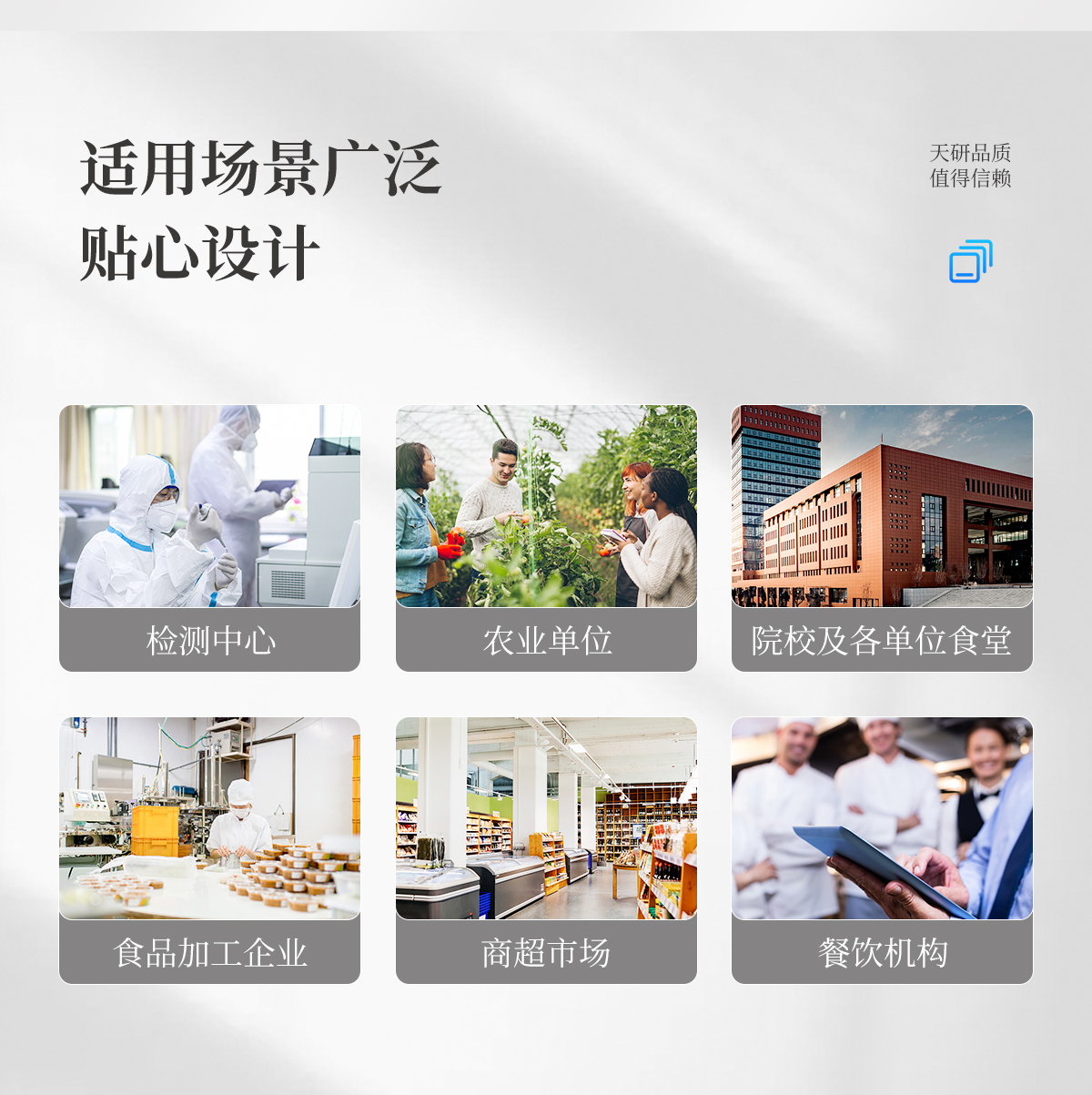 該多功能食品安全檢測儀為集成化食品安全快速檢測分析設備,廣泛應用于市場監(jiān)管局、食品肉產(chǎn)品深加工企業(yè)、學校食堂、衛(wèi)生部門、畜牧部門、屠宰場、檢驗檢疫部門等單位使用。