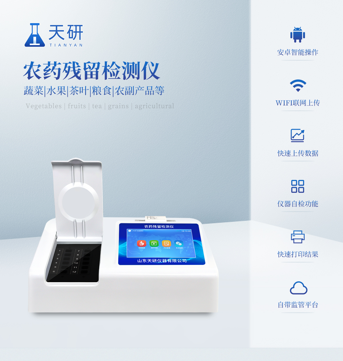 | 乙酰膽堿酯酶和丁酰膽堿酯酶試劑均可以使用,符合國家標(biāo)準(zhǔn)和農(nóng)業(yè)部標(biāo)準(zhǔn)的要求。 | 自動(dòng)判斷樣品是否合格,檢測結(jié)果更加直觀。 | 儀器具有100多種蔬菜名稱菜單庫,分類管理,并可按需添加或刪除蔬菜名,編輯蔬菜名稱,可直接打印出蔬菜名稱。 | 檢測通道:12個(gè)檢測通道,可以同時(shí)測試多個(gè)樣品,循環(huán)檢測,即放即檢,每個(gè)樣品由程序控制分別獨(dú)立工作,不會(huì)互相干擾。 | 智能操作系統(tǒng),采用更加人性化操作,主控采用多核處理器,主頻1.88Ghz,運(yùn)轉(zhuǎn)速度更快速,穩(wěn)定性更強(qiáng)。 | 顯示方式:7英寸高靈敏真彩觸摸屏顯示,人性化中文操作界面,讀數(shù)直觀、簡單。 | 打印機(jī)采用串口5v打印,可選擇手動(dòng)打印或者自動(dòng)打印,三分鐘出打印結(jié)果,打印格式為檢測人姓名、吸光度差值、檢測時(shí)間、檢測機(jī)構(gòu)、樣品名稱及結(jié)果判定。 | 光源采用進(jìn)口超高亮發(fā)光二極管,具有低功耗、高精度、穩(wěn)定性強(qiáng)、光源可控可以關(guān)掉不使用的光源,響應(yīng)速度快等優(yōu)點(diǎn)。 | 智能恒流穩(wěn)壓,光強(qiáng)自動(dòng)校準(zhǔn),長時(shí)間連續(xù)工作光源無溫漂現(xiàn)象。 | 儀器具有GPRS遠(yuǎn)傳功能,可插手機(jī)卡實(shí)現(xiàn)數(shù)據(jù)遠(yuǎn)傳平臺(tái),wifi聯(lián)網(wǎng)功能,可將數(shù)據(jù)快速上傳電腦,進(jìn)行數(shù)據(jù)管理與統(tǒng)計(jì)。 | 采用USB2.0接口設(shè)計(jì),方便數(shù)據(jù)的存貯和移動(dòng),并可隨時(shí)與計(jì)算機(jī)直接相連,并且可用計(jì)算機(jī)控制儀器。實(shí)現(xiàn)數(shù)據(jù)查詢、瀏覽、分析、統(tǒng)計(jì)、打印等。 | 智能化程度高,儀器具有自檢功能:具有開機(jī)自檢和調(diào)零功能,具有自動(dòng)檢測重復(fù)性功能 | 儀器具有自身保護(hù)功能,可設(shè)置用戶名及密碼,防止非工作人員操作等。 | 采用DC12v直流供電,安全系統(tǒng)更高,并且配備6A鋰電池充電器。 | 儀器具有重新校準(zhǔn)、鎖定、恢復(fù)出廠設(shè)置功能。 |
