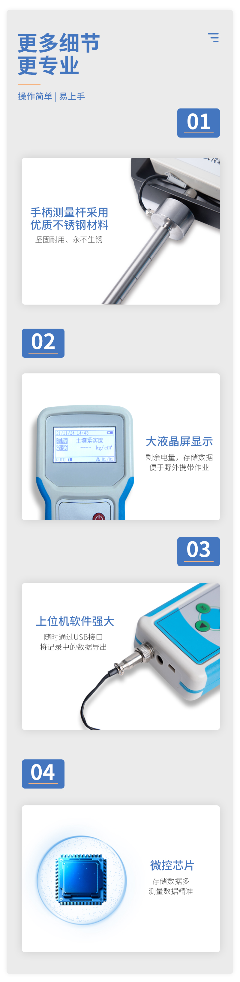 本設(shè)備是一種由手持式采集儀和緊實(shí)度傳感器所組成的一套土壤墑情監(jiān)測(cè)系統(tǒng)。同時(shí)具備操作簡(jiǎn)便,攜帶方便,檢測(cè)迅速可靠等優(yōu)點(diǎn),在領(lǐng)域中可謂獨(dú)樹(shù)一幟。手持式采集儀可根據(jù)用戶需要出廠配置GPS、GPRS數(shù)據(jù)上傳等功能,設(shè)備中的數(shù)據(jù)也可以通過(guò)USB數(shù)據(jù)線連接電腦,并將歷史數(shù)據(jù)導(dǎo)出到電腦中進(jìn)行數(shù)據(jù)分析。