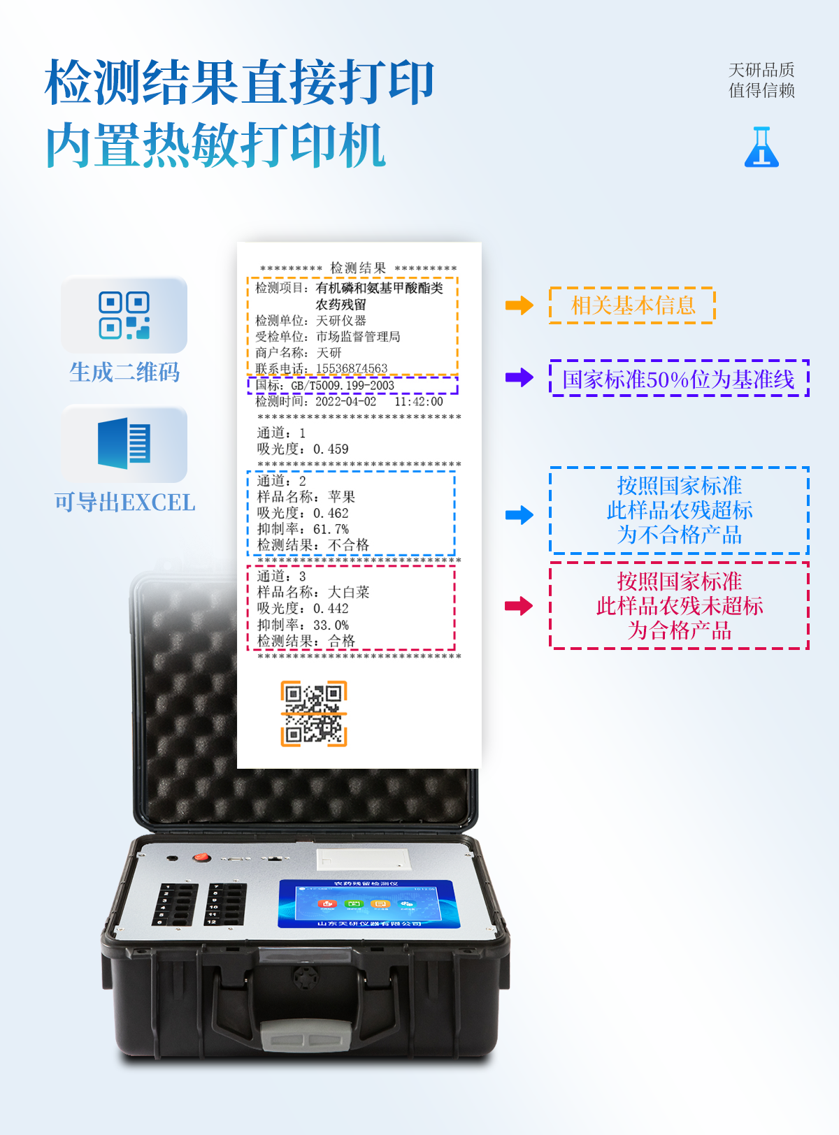 | 機(jī)箱采用工業(yè)級(jí)ABS工程塑料箱,方便攜帶,穩(wěn)固耐用,便于流動(dòng)測(cè)試。 | 智能操作系統(tǒng),采用更加人性化操作,主控采用多核處理器,主頻1.88Ghz,運(yùn)轉(zhuǎn)速度更快速,穩(wěn)定性更強(qiáng)。 | 自動(dòng)判斷樣品是否合格,檢測(cè)結(jié)果更加直觀。 | 儀器具有100多種蔬菜名稱菜單庫,分類管理,并可按需添加或刪除蔬菜名,編輯蔬菜名稱,可直接打印出蔬菜名稱。 | 檢測(cè)通道:18個(gè)檢測(cè)通道,可以同時(shí)測(cè)試多個(gè)樣品,循環(huán)檢測(cè),即放即檢,每個(gè)樣品由程序控制分別獨(dú)立工作,不會(huì)互相干擾。 | 儀器具有wifi聯(lián)網(wǎng)功能,可將數(shù)據(jù)快速上傳電腦,進(jìn)行數(shù)據(jù)管理與統(tǒng)計(jì),4G信號(hào)GPRS遠(yuǎn)傳功能,可插手機(jī)卡實(shí)現(xiàn)數(shù)據(jù)遠(yuǎn)傳平臺(tái),。 | 顯示方式:7英寸高靈敏真彩觸摸屏顯示,人性化中文操作界面,讀數(shù)直觀、簡(jiǎn)單。 | 打印機(jī)采用串口5v打印,可選擇手動(dòng)打印或者自動(dòng)打印,三分鐘出打印結(jié)果,打印格式為檢測(cè)人姓名、吸光度差值、檢測(cè)時(shí)間、檢測(cè)機(jī)構(gòu)、樣品名稱及結(jié)果判定。 | 光源采用進(jìn)口超高亮發(fā)光二極管,具有低功耗、高精度、穩(wěn)定性強(qiáng)、光源可控可以關(guān)掉不使用的光源,響應(yīng)速度快等優(yōu)點(diǎn)。 | 智能恒流穩(wěn)壓,光強(qiáng)自動(dòng)校準(zhǔn),長(zhǎng)時(shí)間連續(xù)工作光源無溫漂現(xiàn)象。 | 采用USB2.0接口設(shè)計(jì),方便數(shù)據(jù)的存貯和移動(dòng),并可隨時(shí)與計(jì)算機(jī)直接相連,并且可用計(jì)算機(jī)控制儀器。實(shí)現(xiàn)數(shù)據(jù)查詢、瀏覽、分析、統(tǒng)計(jì)、打印等。 | 智能化程度高,儀器具有自檢功能:具有開機(jī)自檢和調(diào)零功能,具有自動(dòng)檢測(cè)重復(fù)性功能 | 儀器具有自身保護(hù)功能,可設(shè)置用戶名及密碼,防止非工作人員操作等。 | 采用DC12v直流供電,安全系統(tǒng)更高,并且配備6A鋰電池充電器。 | 儀器具有重新校準(zhǔn)、鎖定、恢復(fù)出廠設(shè)置功能。 |