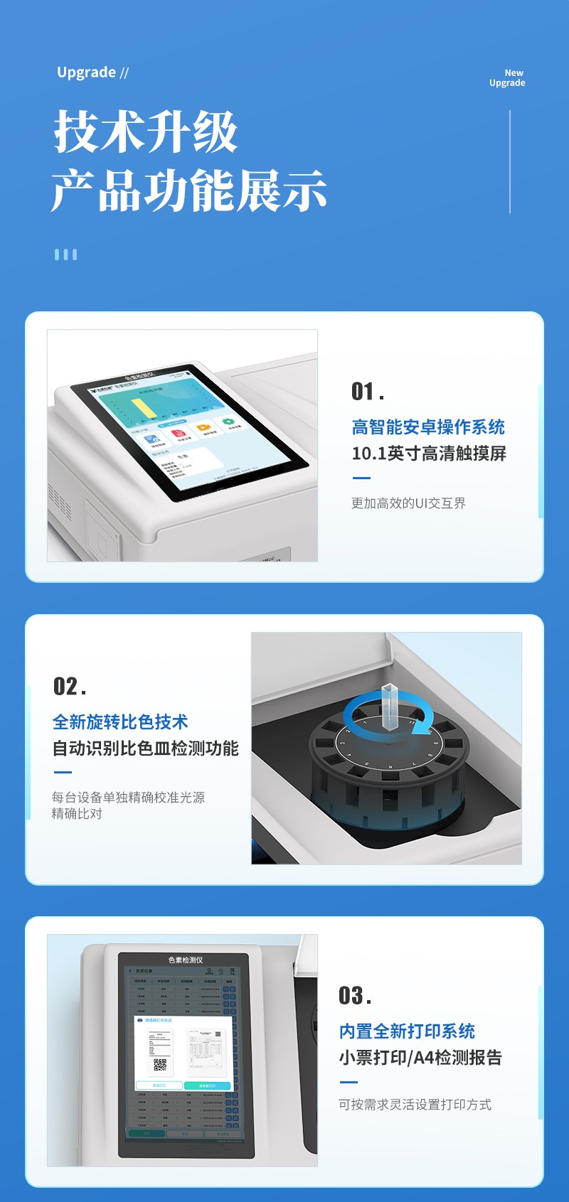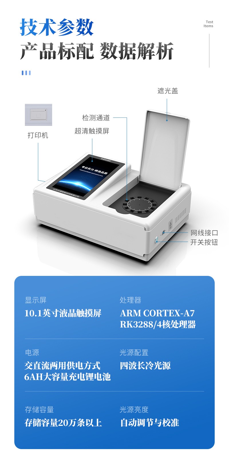 | 儀器采用臺式一體化系統(tǒng)檢測技術(shù),將分光光度模塊、新型農(nóng)殘檢測模塊、數(shù)字化管理模塊、無線通訊模塊高度集成于一體,支持檢測200種食品安全檢測項(xiàng)目,同時預(yù)留升級檢測方法。 | 儀器檢測模塊標(biāo)準(zhǔn)化、智能化,可隨意自由組合。檢測箱體內(nèi)置多個標(biāo)準(zhǔn)檢測單元,檢測模塊可以調(diào)整配置。 | 儀器采用全新安卓智能系統(tǒng),主控芯片采用 ARM Cortex-A7,RK3288/4核處理器,10.1寸高清液晶觸摸豎屏,更加**的UI交互界面,運(yùn)轉(zhuǎn)快捷;儀器配備無線通信模塊: 4G(APN)通訊模塊、Wifi模塊,藍(lán)牙傳輸,同時具有雙USB接口以及RJ45接口能以多種方式實(shí)現(xiàn)數(shù)據(jù)保存和數(shù)據(jù)傳輸功能。 | 創(chuàng)新檢測模式: | ★檢測通道:≥12通道;采用精密旋轉(zhuǎn)比色池設(shè)計(jì),使用同芯片同光源校準(zhǔn)精度,解決不同光源之間的誤差值。1-12通道間誤差0.1%。(**號:ZL202022821055.2) | ★儀器具有自動識別比色皿檢測功能,即:將樣品比色皿放入儀器后,點(diǎn)擊樣品檢測,儀器自動識別比色皿進(jìn)行通道檢測。 | 進(jìn)口高精光源: | 高精度進(jìn)口四波長冷光源,通道配置 410、520、590、630nm 波長光源,一個光源芯片驅(qū)動一個光源,誤差極小,每臺設(shè)備單獨(dú)**校準(zhǔn)光源,**比對,同時參照四種不同波段光源全方位覆蓋市面上99%的農(nóng)殘食品項(xiàng)目檢測。 | 智能化操作系統(tǒng): | 便捷操作系統(tǒng):設(shè)備檢測時可在同一檢測界面自動對應(yīng)相關(guān)檢測通道一次性選擇1-12個樣品名稱,無須退出界面,節(jié)省操作時間。 | 數(shù)據(jù)集成系統(tǒng):設(shè)備首頁自動統(tǒng)計(jì)檢測數(shù)據(jù)包含:周檢測數(shù)據(jù)、月檢測數(shù)據(jù),全部檢測總數(shù)量,均包含檢測總數(shù),合格數(shù),不合格數(shù),以及相關(guān)柱形分析圖,對各項(xiàng)檢測數(shù)據(jù)清晰掌握,無需電腦查詢,更加快捷直觀。 | 項(xiàng)目預(yù)設(shè)系統(tǒng):支持添加單個及多個相同或不相同的任務(wù)預(yù)設(shè),一鍵快速調(diào)取,每一個任務(wù)分別可以設(shè)置不同的樣品、批次、編號、來源、備注、抽樣信息、檢測信息、受檢信息、復(fù)核信息等更多信息。無縫鏈接平臺和APP實(shí)時查看下發(fā)任務(wù)。 | 數(shù)據(jù)監(jiān)管系統(tǒng):同步對接監(jiān)管平臺,數(shù)據(jù)可局域網(wǎng)和互聯(lián)網(wǎng)數(shù)據(jù)上傳,檢測結(jié)果可選擇直接傳至食品安全監(jiān)管平臺。集成OSS輸出存儲服務(wù)、區(qū)分設(shè)備定向管理應(yīng)用,進(jìn)行區(qū)域食品安全監(jiān)管及大數(shù)據(jù)分析處理與數(shù)據(jù)統(tǒng)計(jì),檢測區(qū)域食品安全長短期動態(tài),達(dá)到食品安全問題預(yù)估、預(yù)警。 | 自定義打印系統(tǒng):內(nèi)置全新打印系統(tǒng),新創(chuàng)自定義打印方式,可按需靈活設(shè)置開啟或關(guān)閉:產(chǎn)品合格證(國家農(nóng)業(yè)部標(biāo)準(zhǔn)要求),二維碼,抽樣信息、檢測信息,受檢信息、復(fù)核信息、抽樣日期、檢測日期等信息的打印。 | 系統(tǒng)遠(yuǎn)程更新功能:可定向分客戶分儀器更新系統(tǒng),按照不同客戶后期實(shí)際需求添加項(xiàng)目,無需機(jī)器返廠,即可遠(yuǎn)程實(shí)時升級全新系統(tǒng),節(jié)省時間成本及避免運(yùn)輸造成設(shè)備損壞。 | 儀器主機(jī)采用一體化防水、抗壓、防撞擊、防腐蝕箱體設(shè)計(jì),同時配備交直流供電,可連接車載電源,可選配大容量充電鋰電池,滿足現(xiàn)場野外檢測需求。 | 安全證書,放心保障:儀器具有中國計(jì)量科學(xué)研究院校準(zhǔn)證書,**認(rèn)證。 |
