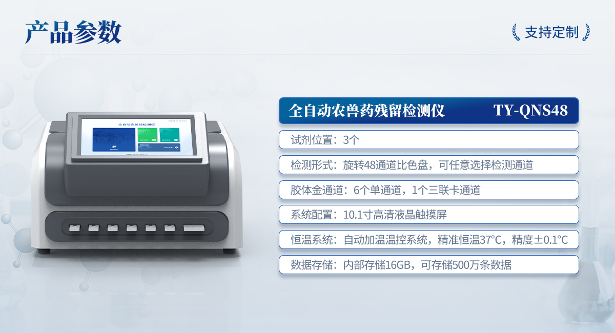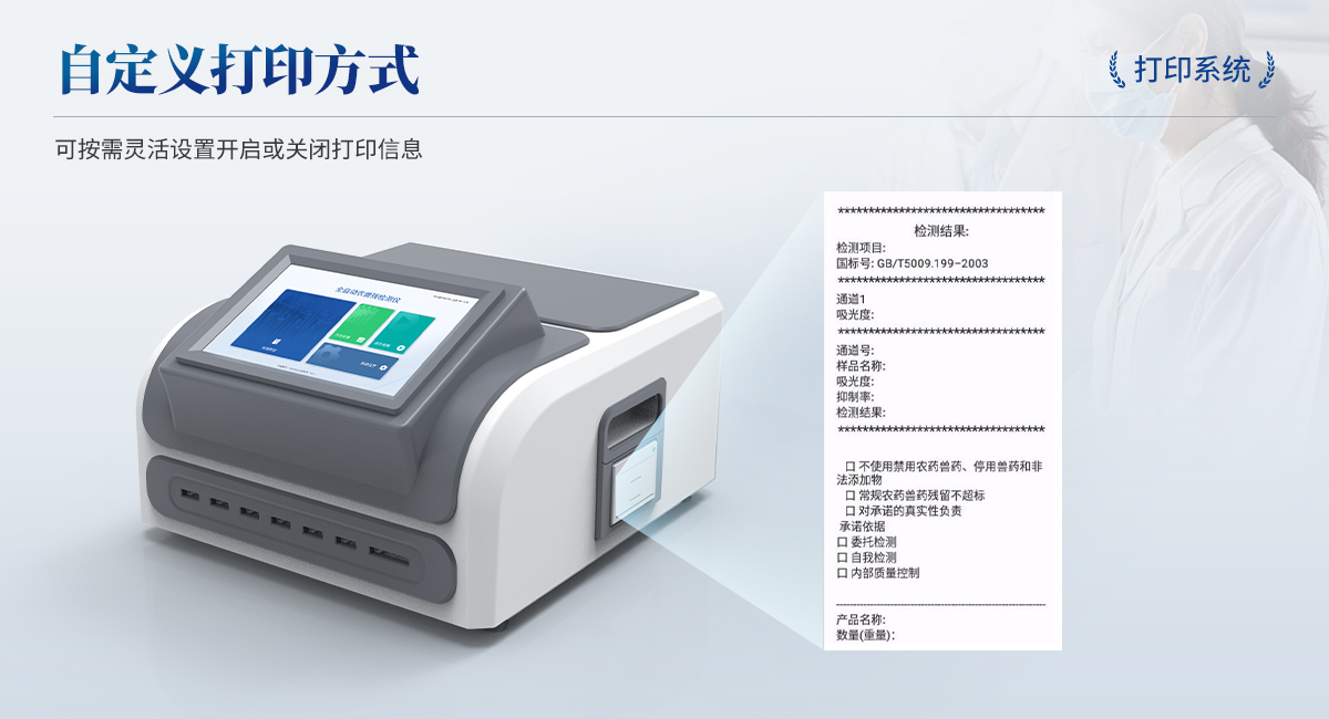 | 1. 試劑位置:3個(gè) | 2. 農(nóng)殘檢測(cè)盤:旋轉(zhuǎn)48通道比色盤,可任意選擇檢測(cè)通道,自動(dòng)對(duì)應(yīng)選擇通道。 | 3. 膠體金通道:6個(gè)單通道,1個(gè)三聯(lián)卡通道,可讀取檢測(cè)卡結(jié)果,自動(dòng)采集、處理分析,自動(dòng)判斷檢測(cè)結(jié)果,并具備自動(dòng)判空功能。 | 4.系統(tǒng)配置:10.1寸高清液晶觸摸屏,采用ARM Cortex-A7,RK3288/4核處理器,運(yùn)行內(nèi)存1GB。Android7.1.1 系統(tǒng)分辨率1280×800。 | 5.恒溫系統(tǒng):具有自動(dòng)加溫溫控系統(tǒng),精準(zhǔn)恒溫37℃,精度±0.1℃。 | 6.添加系統(tǒng):儀器按照試劑要求自動(dòng)、按時(shí)、按量加入試劑,并且自動(dòng)對(duì)未正常放置的樣本或異常的樣本進(jìn)行檢查并提示。 | 7.清洗功能:儀器具備回流及自動(dòng)清洗管路功能,避免試劑污染。 | 8.混勻功能:設(shè)備具備自動(dòng)混勻功能。 | 9.光源校準(zhǔn):設(shè)備可自動(dòng)校準(zhǔn),確保檢測(cè)準(zhǔn)確度。 | 10.實(shí)時(shí)監(jiān)控:儀器測(cè)試過程中屏幕顯示運(yùn)行狀態(tài),可實(shí)時(shí)查看。 | 11.數(shù)據(jù)存儲(chǔ):內(nèi)部存儲(chǔ)16GB,可存儲(chǔ)500萬條數(shù)據(jù)。 | 12.樣品多選功能:設(shè)備具備樣品一鍵多選功能,選擇樣品自動(dòng)匹配檢測(cè)通道。 | 13.項(xiàng)目預(yù)設(shè):可提前設(shè)置單個(gè)及多個(gè)相同或不相同的檢測(cè)任務(wù),可單次或者多次調(diào)取,減少檢測(cè)時(shí)間。 | 14.自定義打印系統(tǒng):內(nèi)置自定義打印系統(tǒng),可按需靈活設(shè)置開啟或關(guān)閉:產(chǎn)品合格證(國(guó)家農(nóng)業(yè)部標(biāo)準(zhǔn)),二維碼,抽樣信息、檢測(cè)信息,受檢信息等信息的打印。 | 15.A4版本報(bào)告打印功能:設(shè)備可自動(dòng)生成A4版報(bào)告,A4報(bào)告帶二維碼,可掃描二維碼生成電子版,并可識(shí)別真?zhèn)巍?/td> | 16.傳輸方式:儀器配備無線通信模塊: 4G(APN)通訊模塊、Wifi模塊,藍(lán)牙傳輸模塊,同時(shí)具有USB接口以及RJ45接口能以多種方式實(shí)現(xiàn)數(shù)據(jù)保存和數(shù)據(jù)傳輸功能,設(shè)備數(shù)據(jù)可以同步上傳至平臺(tái)。 | 17.數(shù)據(jù)監(jiān)管系統(tǒng):設(shè)備自帶監(jiān)管平臺(tái),并可同步對(duì)接監(jiān)管平臺(tái),數(shù)據(jù)可局域網(wǎng)和互聯(lián)網(wǎng)數(shù)據(jù)上傳,檢測(cè)結(jié)果可直接傳至食品安全監(jiān)管平臺(tái)。達(dá)到食品安全問題預(yù)估、預(yù)警。 | 18.系統(tǒng)遠(yuǎn)程更新功能:無需設(shè)備返廠,即可遠(yuǎn)程實(shí)時(shí)升級(jí)全新系統(tǒng),節(jié)省時(shí)間成本及避免運(yùn)輸造成設(shè)備損。 |