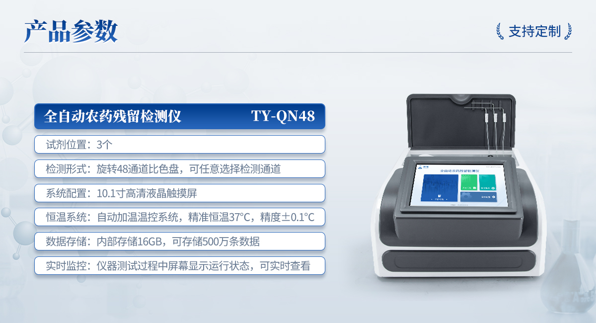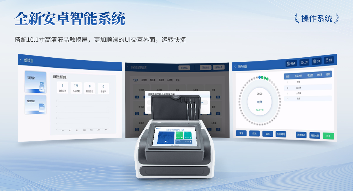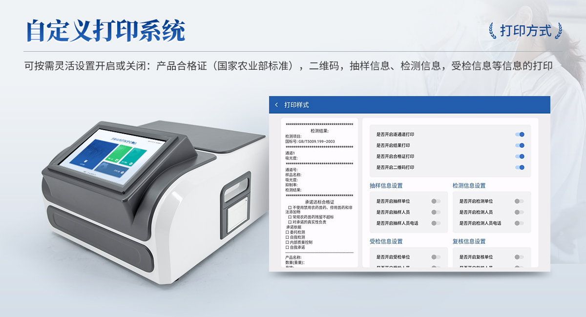 | 1. 試劑位置:3個(gè) | 2. 檢測(cè)形式:旋轉(zhuǎn)48通道比色盤,可任意選擇檢測(cè)通道,自動(dòng)對(duì)應(yīng)選擇通道。 | 3. 系統(tǒng)配置:10.1寸高清液晶觸摸屏,采用ARM Cortex-A7,RK3288/4核處理器,運(yùn)行內(nèi)存1GB。Android7.1.1 系統(tǒng)分辨率1280×800。 | 4.恒溫系統(tǒng):具有自動(dòng)加溫溫控系統(tǒng),精準(zhǔn)恒溫37℃,精度±0.1℃。 | 5.添加系統(tǒng):儀器按照試劑要求自動(dòng)、按時(shí)、按量加入試劑,并且自動(dòng)對(duì)未正常放置的樣本或異常的樣本進(jìn)行檢查并提示。 | 6.清洗功能:儀器具備回流及自動(dòng)清洗管路功能,避免試劑污染。 | 7.混勻功能:設(shè)備具備自動(dòng)混勻功能。 | 8.光源校準(zhǔn):設(shè)備可自動(dòng)校準(zhǔn),確保檢測(cè)準(zhǔn)確度。 | 9.實(shí)時(shí)監(jiān)控:儀器測(cè)試過程中屏幕顯示運(yùn)行狀態(tài),可實(shí)時(shí)查看。 | 10.數(shù)據(jù)存儲(chǔ):內(nèi)部存儲(chǔ)16GB,可存儲(chǔ)500萬條數(shù)據(jù)。 | 11.樣品多選功能:設(shè)備具備樣品一鍵多選功能,選擇樣品自動(dòng)匹配檢測(cè)通道。 | 12.項(xiàng)目預(yù)設(shè):可提前設(shè)置單個(gè)及多個(gè)相同或不相同的檢測(cè)任務(wù),可單次或者多次調(diào)取,減少檢測(cè)時(shí)間。 | 13.自定義打印系統(tǒng):內(nèi)置自定義打印系統(tǒng),可按需靈活設(shè)置開啟或關(guān)閉:產(chǎn)品合格證(國(guó)家農(nóng)業(yè)部標(biāo)準(zhǔn)),二維碼,抽樣信息、檢測(cè)信息,受檢信息等信息的打印。 | 14.A4版本報(bào)告打印功能:設(shè)備可自動(dòng)生成A4版報(bào)告,A4報(bào)告帶二維碼,可掃描二維碼生成電子版,并可識(shí)別真?zhèn)巍?/td> | 15.傳輸方式:儀器配備無線通信模塊: 4G(APN)通訊模塊、Wifi模塊,藍(lán)牙傳輸模塊,同時(shí)具有USB接口以及RJ45接口能以多種方式實(shí)現(xiàn)數(shù)據(jù)保存和數(shù)據(jù)傳輸功能,設(shè)備數(shù)據(jù)可以同步上傳至平臺(tái)。 | 16.數(shù)據(jù)監(jiān)管系統(tǒng):設(shè)備自帶監(jiān)管平臺(tái),并可同步對(duì)接監(jiān)管平臺(tái),數(shù)據(jù)可局域網(wǎng)和互聯(lián)網(wǎng)數(shù)據(jù)上傳,檢測(cè)結(jié)果可直接傳至食品安全監(jiān)管平臺(tái)。達(dá)到食品安全問題預(yù)估、預(yù)警。 | 17.系統(tǒng)遠(yuǎn)程更新功能:無需設(shè)備返廠,即可遠(yuǎn)程實(shí)時(shí)升級(jí)全新系統(tǒng),節(jié)省時(shí)間成本及避免運(yùn)輸造成設(shè)備損。 |