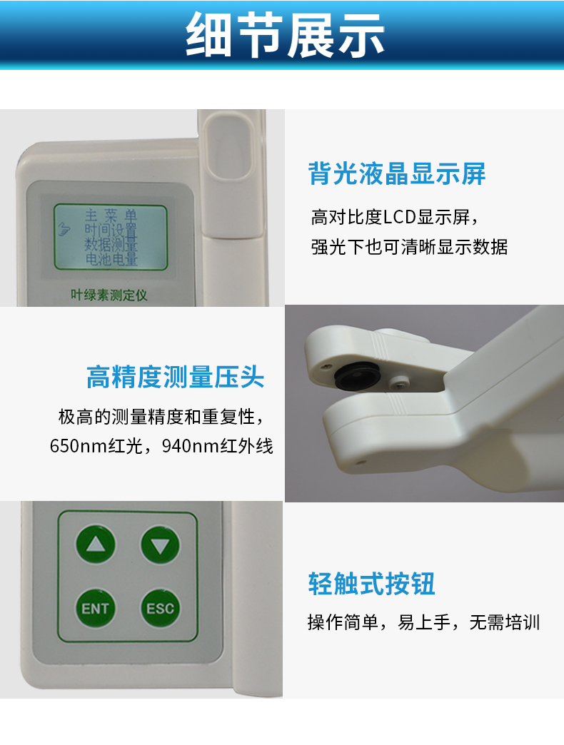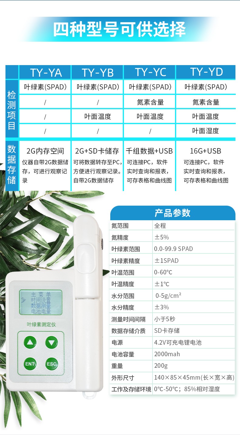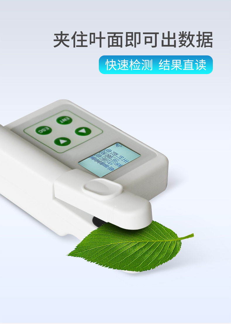 氮素含量一般情況下直接反應(yīng)作物的健康情況,生長狀態(tài)、了解植物真實的硝基需求量和土壤硝基的缺乏程度或是否過多地施加了氮肥,廣泛應(yīng)用于氮肥管理,除草劑應(yīng)用,葉片衰老,環(huán)境脅迫等研究,葉綠素測量儀在農(nóng)業(yè)種植過程中有很大的意義。 葉 綠素含量的測定結(jié)果是SPAD值,是葉片在兩種波長650nm 和940nm,葉片傳輸光的數(shù)量進行比值計算,來確定葉片當前葉綠素的相對數(shù)量(兩種波長范圍內(nèi)的透光系數(shù)來確定葉片當前葉綠素的相對數(shù)量 ),SPAD值與葉綠素之間成正比關(guān)系,因此SPAD值往往間接地可代表葉綠素值,從而可以評估植物健康狀況、生長狀態(tài),因而在農(nóng)業(yè)中,時常使用葉綠素計 來進行對植物葉綠素含量進行檢測,以此來進行指導氮肥的施用量,因而在農(nóng)業(yè)種植過程中使用葉綠素計來進行指導氮元素含量的施肥,同時在很多植物中,以此來 進行判斷植物的抗逆性。 葉溫常用來表示植物的體溫狀況,植物葉片中所有的化學反應(yīng),都受葉片溫度的影響,在植物生理活動的分析中經(jīng)常用到。葉溫與 氣溫的差值,可以表明植物的缺水情況或受旱程度。因為當水分供應(yīng)充足時,植物蒸騰正常,蒸騰耗熱可以降低植物體溫,這時葉溫比氣溫低;反之受旱時,植物體 溫上升,可高于當時的氣溫。