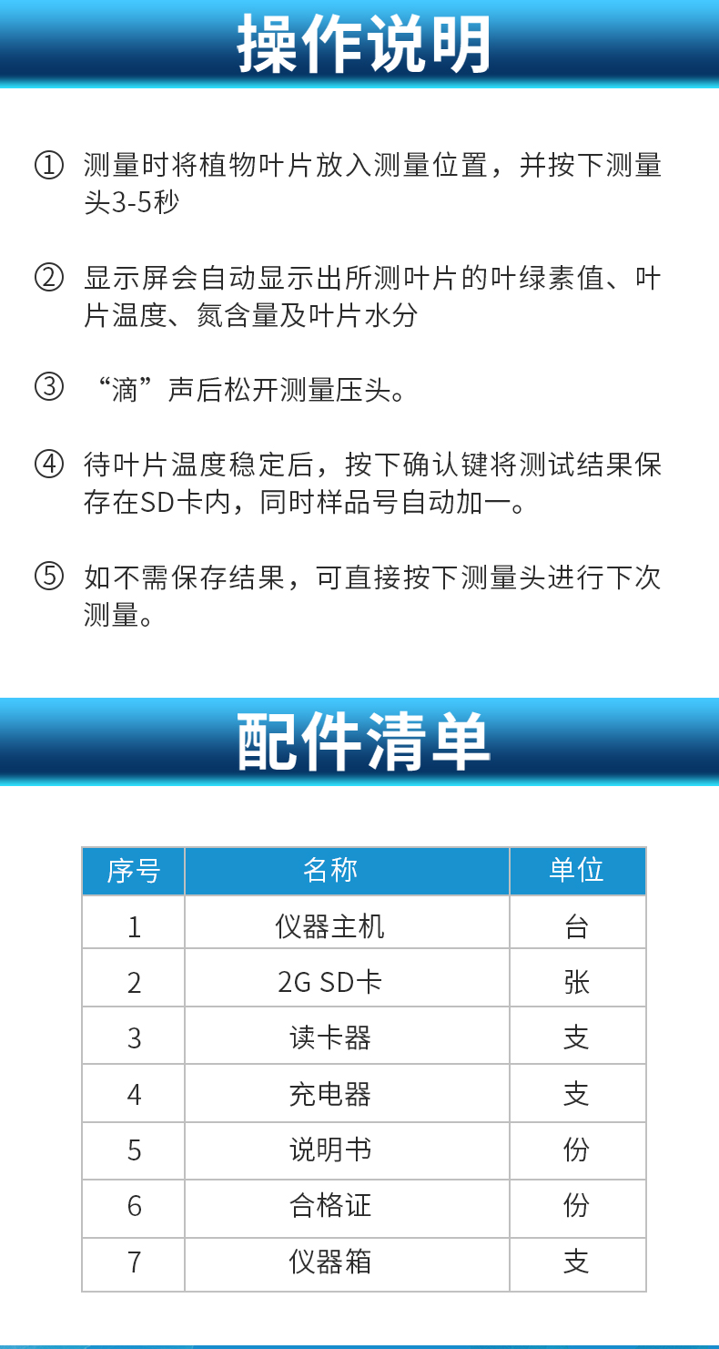 | 測定指標:氮素、葉綠素、葉溫 | 測量范圍: | 葉綠素:0.0-99.9SPAD 氮含量:0.0-99.9mg/g 葉面溫度:-10-99.9℃ | 測量精度: | 葉綠素:±1.0 SPAD單位以內(nèi) (室溫下,SPAD值介于0-50) 氮含量: ±5% 葉面溫度:±0.5℃ | 重復(fù)性: | 葉綠素:±0.3 SPAD單位以內(nèi) (SPAD值介于0-50) 氮含量:±0.5單位 葉面溫度:±0.2℃ | 測量面積:2mm*2mm | 測量時間間隔:小于3秒 | 數(shù)據(jù)存儲容量:1000組數(shù)據(jù) | 電源:4.2V可充電鋰電池 | 電池容量:2000mah | 重量:200g |