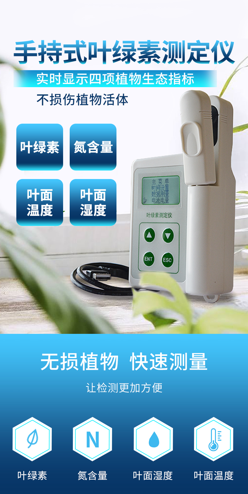| 測(cè)量對(duì)象:陸地植物葉片 | 測(cè)量原理: 650nm和940nm兩種波長(zhǎng)下光密度差 | 測(cè)量范圍 0.0-99.9 SPAD | 測(cè)量面積 2mm*3mm | 測(cè)量精度 ±1.0 SPAD單位以內(nèi) (室溫下,SPAD值介乎0-50) | 重復(fù)性 ±0.3 SPAD單位以內(nèi) (SPAD值介乎0-50,保持測(cè)量位置不變) | 測(cè)量時(shí)間間隔 小于2秒 | 測(cè)量面積:2mm*2mm | 測(cè)量時(shí)間間隔:小于3秒 | 內(nèi)存 內(nèi)存16GB,可計(jì)算/顯示平均值,以及刪除異常值 | 樣品厚度** 1 mm | 樣品插入深度 10 mm | 電源 4.2V可充電鋰電池 | 電池容量 2000mah | 重量 250g | 外形尺寸 140×85×45mm(長(zhǎng)×寬×高) | 操作溫度/濕度范圍:0 - 50°C,相對(duì)濕度85% | 儲(chǔ)存溫度/濕度范圍:20 - 55°C,相對(duì)濕度85% | 標(biāo)準(zhǔn)配置:主機(jī), 充電器,USB數(shù)據(jù)線,便攜鋁箱,說(shuō)明書等 |