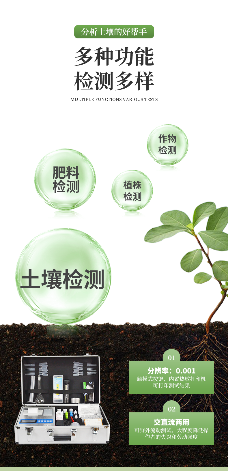 | 《機箱/藥劑一體式鋁合金機箱》設(shè)計,便于攜帶、堅固耐用,配套成品藥劑。 | 微電腦控制,數(shù)字化線路、程序化設(shè)計,液晶顯示,交直流兩用,可野外流動測試,大程度降低操作者的失誤和勞動強度。 | 分辨率:0.001,觸摸式按鍵,內(nèi)置熱敏打印機,可打印測試結(jié)果。 | 全項目土壤肥料養(yǎng)分速測儀可檢測土壤及化肥、有機肥(含葉面肥、水溶肥、噴施肥等)、植株中的速效氮、速效磷、有效鉀、全氮、全磷、全鉀、有機質(zhì)、酸堿度,鈣、鎂、硫、鐵、錳、硼、鋅、銅、氯、硅等各種中微量元素。 | 采用高亮LED光源,濾光式處理,保證光源波長穩(wěn)定, 硅半導體作為信號接收系統(tǒng), 壽命長達10萬小時級別。光源穩(wěn)定,重現(xiàn)性好,準確度高。 | 比色槽部分采用單通道設(shè)計,無機械位移及磨損,光路測試定位**,保證測定結(jié)果精度。 | 配套專家施肥系統(tǒng)數(shù)據(jù),可對百余種全國農(nóng)業(yè)、果樹、 經(jīng)濟作物的目標產(chǎn)量科學計算推薦施肥量。 | 采用高精度濾光片技術(shù)自主**分析方法(**號:ZL 2018 2 1777724.7),保證檢測結(jié)果優(yōu)于國標要求。 |
