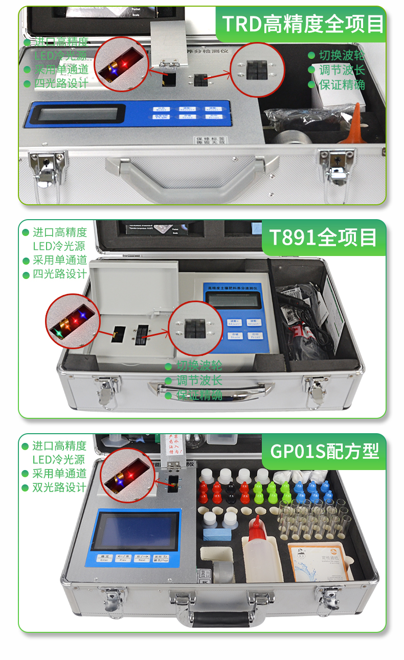| 全國(guó)《機(jī)箱/藥劑一體式鋁合金機(jī)箱》設(shè)計(jì),便于攜帶、堅(jiān)固耐用,配套成品藥劑。 | 微電腦控制,數(shù)字化線路、程序化設(shè)計(jì),液晶顯示,交直流兩用,測(cè)試數(shù)據(jù)可存儲(chǔ)查詢,可野外流動(dòng)測(cè)試,**程度降低操作者的失誤和勞動(dòng)強(qiáng)度。 | 分辨率:0.001,觸摸式按鍵,內(nèi)置新一代熱敏打印機(jī),可打印測(cè)試結(jié)果。 | 肥料養(yǎng)分專用快速檢測(cè)儀可檢測(cè)化肥、有機(jī)肥中的速效氮、速效磷、有效鉀、全氮、全磷、全鉀、有機(jī)質(zhì)含量等。 | 采用高亮度 LED 燈作為光源, 硅半導(dǎo)體作為信號(hào)接收系統(tǒng), 壽命長(zhǎng)達(dá)10萬小時(shí)級(jí)別。光源穩(wěn)定,一致性好。 | 比色槽部分采用單通道、雙光路設(shè)計(jì),無機(jī)械位移及磨損,光路測(cè)試定位**,保證測(cè)定結(jié)果精度。 | 采用自主發(fā)明分析方法,保證檢測(cè)結(jié)果絕對(duì)達(dá)到國(guó)標(biāo)要求。 | 肥料打印結(jié)果為百分含量,測(cè)試誤差小于1%。 |