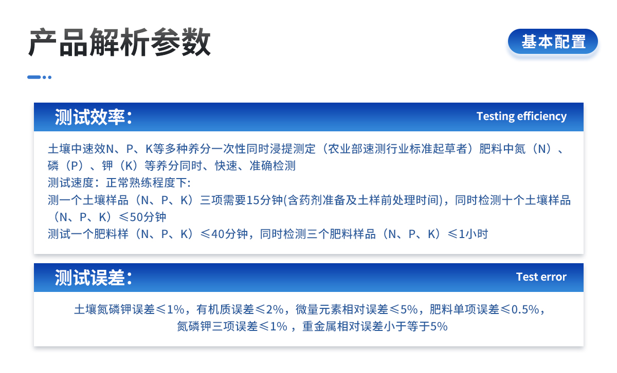 | 土壤中速效N、P、K等多種養(yǎng)分一次性同時(shí)浸提測(cè)定(農(nóng)業(yè)部速測(cè)行業(yè)標(biāo)準(zhǔn)起草者)。 | 肥料中氮(N)、磷(P)、鉀(K)等養(yǎng)分同時(shí)、快速、準(zhǔn)確檢測(cè)。 | 測(cè)試速度:正常熟練程度下: | 測(cè)一個(gè)土壤樣品(N、P、K)三項(xiàng)需要20分鐘(含藥劑準(zhǔn)備及土樣前處理時(shí)間),同時(shí)檢測(cè)三個(gè)土壤樣品(N、P、K)≤40分鐘,同時(shí)測(cè)8個(gè)土樣≤1小時(shí)。 | 測(cè)試一個(gè)肥料樣(N、P、K)≤50分鐘,同時(shí)檢測(cè)三個(gè)肥料樣品(N、P、K)≤1.5小時(shí)。 |