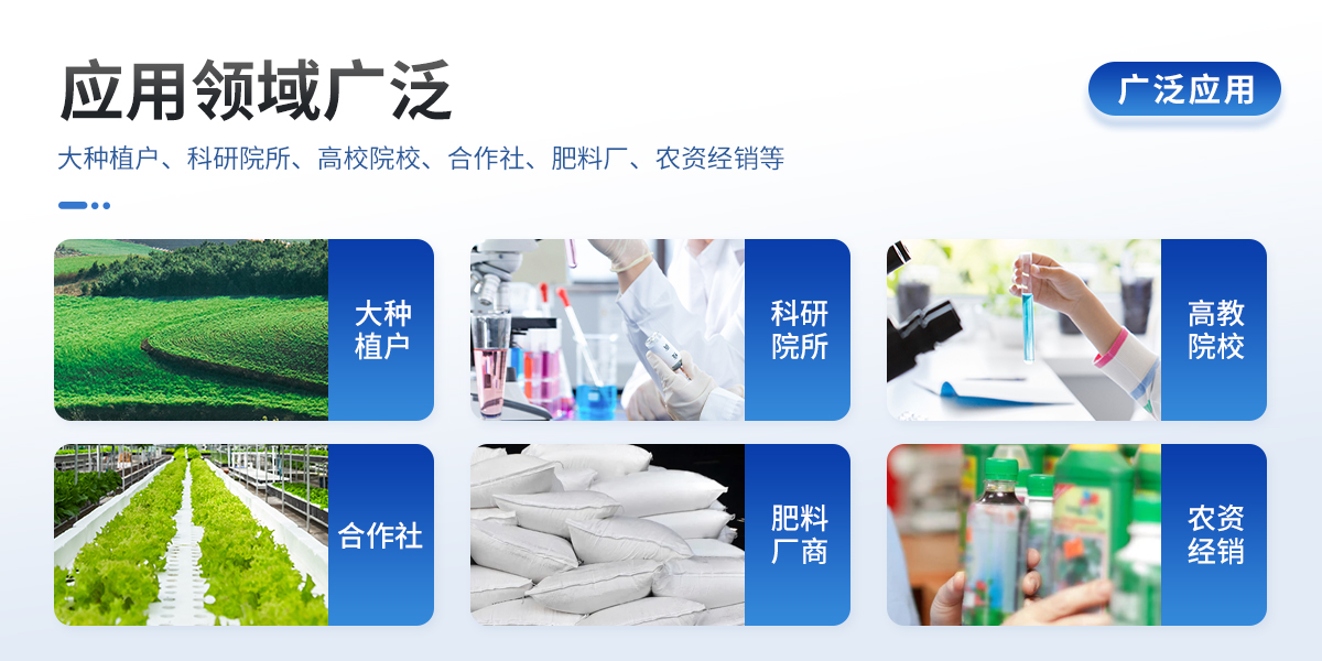 | 1、土壤養(yǎng)分:●土壤銨態(tài)氮、土壤有效磷、土壤速效鉀、土壤硝態(tài)氮、土壤水解氮、土壤全氮、土壤全磷、土壤全鉀、土壤有機質(丘林法)、土壤有機質(浸提法)、土壤總有機碳、土壤碳氮比、PH值、含鹽量、水分?!裢寥乐形⒘吭兀和寥棱}、土壤鎂、土壤硫、土壤硅、土壤硼、土壤鐵、土壤銅、土壤錳、土壤鋅、土壤氯、土壤鉬。 | 2、肥料養(yǎng)分:●單質肥:氮肥中銨態(tài)氮、肥料硝態(tài)氮、尿素氮、縮二脲、磷肥中磷、磷肥中水溶性磷、鉀肥中鉀;●復合肥全氮、復合肥全磷、復合肥全鉀;●有機肥全氮、有機肥全磷、有機肥全鉀、有機肥硝態(tài)氮、有機肥速效磷、有機肥速效鉀、有機肥酸解氮、有機質;●水溶性腐植酸(風化煤)、水溶性腐植酸(褐煤)、水溶性腐植酸(泥炭)、游離態(tài)腐植酸(風化煤)、游離態(tài)腐植酸(褐煤)、游離態(tài)腐植酸(泥炭);●水溶肥全氮、水溶肥全磷、水溶肥全鉀;●葉面肥全氮、葉面肥全磷、葉面肥全鉀;●各種肥料微量元素:肥料鈣、肥料鎂、肥料硫、肥料硅、肥料硼、肥料鐵、肥料銅、肥料錳、肥料鋅、肥料氯、肥料鉬。 | 3、鮮作物營養(yǎng):●作物硝態(tài)氮、作物銨態(tài)氮、作物磷、作物鉀;●作物中微量元素:作物鈣、作物鎂、作物硫、作物硅、作物硼、作物鐵、作物銅、作物錳、作物鋅、作物氯、作物鉬;●作物中硝酸鹽、亞硝酸鹽。 | 4、干植株營養(yǎng):●植株全氮、植株全磷、植株全鉀 | 5、煙葉營養(yǎng):●全氮、全磷、全鉀、還原糖、水溶性總糖、硼、錳、鐵、銅、鈣、鎂等20項。 | 6、水質中:●銨態(tài)氮、水中磷、水中鉀、硝酸鹽、亞硝酸鹽、硬度、PH、鐵、銅、錳、鋅、硼、氯、硫、硅、鉬等 |