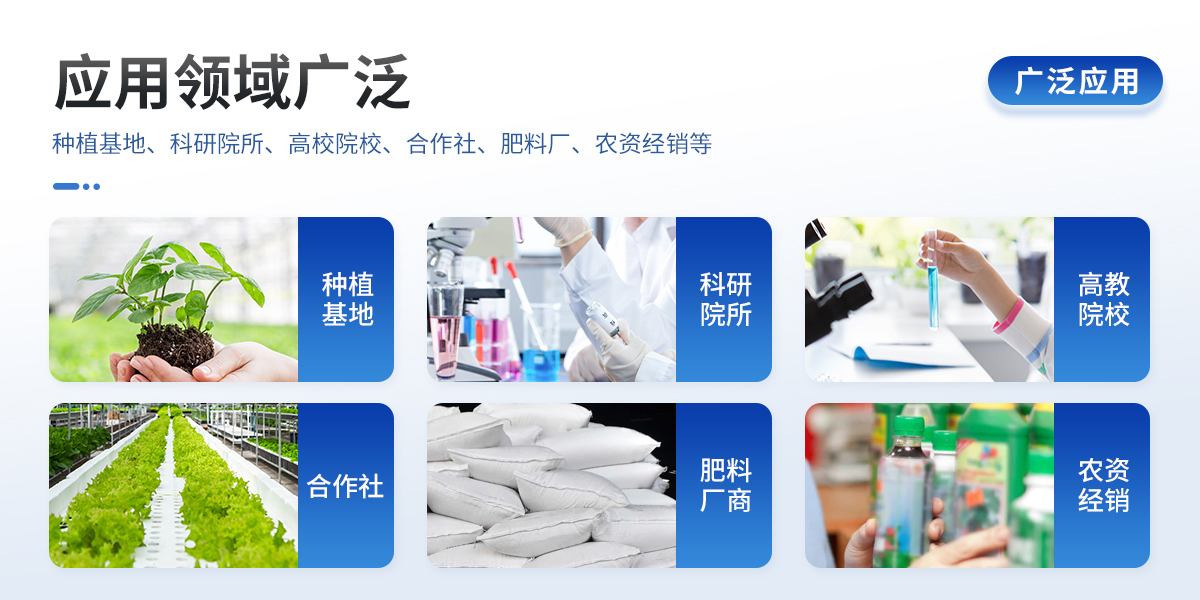 | 土壤養(yǎng)分:●土壤銨態(tài)氮、土壤有效磷、土壤速效鉀、土壤硝態(tài)氮、土壤堿解氮、土壤全氮、土壤全磷、土壤全鉀、土壤有機質(zhì)(丘林法)、土壤有機質(zhì)(浸提法)、PH值、含鹽量、水分?!裢寥乐形⒘吭兀和寥棱}、土壤鎂、土壤硫、土壤硅、土壤硼、土壤鐵、土壤銅、土壤錳、土壤鋅、土壤氯;●土壤重金屬:土壤鉛、土壤砷、土壤鎘、土壤鉻、土壤汞。 | 環(huán)境:土壤濕度、土壤溫度、土壤電導率、空氣溫度、空氣濕度、露點、大氣壓力、光照度、二氧化碳; | 肥料養(yǎng)分:●單質(zhì)肥:氮肥中銨態(tài)氮、肥料硝態(tài)氮、尿素氮、縮二脲、磷肥中磷、磷肥中水溶性磷、鉀肥中鉀;●復合肥全氮、復合肥全磷、復合肥全鉀;●有機肥全氮、有機肥全磷、有機肥全鉀、有機肥硝態(tài)氮、有機肥速效磷、有機肥速效鉀、有機肥酸解氮、有機質(zhì);●水溶性腐植酸(風化煤)、水溶性腐植酸(褐煤)、水溶性腐植酸(泥炭)、游離態(tài)腐植酸(風化煤)、游離態(tài)腐植酸(褐煤)、游離態(tài)腐植酸(泥炭);●水溶肥全氮、水溶肥全磷、水溶肥全鉀;●葉面肥全氮、葉面肥全磷、葉面肥全鉀;●各種肥料微量元素:肥料鈣、肥料鎂、肥料硫、肥料硅、肥料硼、肥料鐵、肥料銅、肥料錳、肥料鋅、肥料氯;●肥料重金屬:肥料鉛、肥料砷、肥料鎘、肥料鉻、肥料汞。 | 鮮作物營養(yǎng):●作物硝態(tài)氮、作物銨態(tài)氮、作物磷、作物鉀;●作物中微量元素:作物鈣、作物鎂、作物硫、作物硅、作物硼、作物鐵、作物銅、作物錳、作物鋅、作物氯;●作物中硝酸鹽、亞硝酸鹽、總糖量、還原糖、蛋白質(zhì)。 | 干植株營養(yǎng):●植株全氮、植株全磷、全鉀、植株中微量元素:植株全鈣、植株全鎂、植株全硫、植株全鐵、植株全錳、植株全硼、植株全鋅、植株全銅、植株全氯、植株全硅。 | 煙葉營養(yǎng):●全氮、全磷、全鉀、還原糖、水溶性總糖、硼、錳、鐵、銅、鈣、鎂等20項。 | 食品(水果、蔬菜等):●農(nóng)藥殘留、硝酸鹽、亞硝酸鹽、鉛、砷、鎘、鉻、汞、銅、鋁、二氧化硫、雙氧水、苯甲酸鈉、山梨酸、糖精鈉、甜蜜素、硫酸鎂、甲醛、吊白塊、硼砂、溴酸鉀、總酸、色素、蛋白質(zhì)、葡萄糖、淀粉酶等項。 | 水質(zhì)中:COD、氨氮、總磷、總氮、余氯、溶解氧、二氧化氯、水中氰化物;重金屬鉛、砷、鎘、鉻、汞;水中硝酸鹽、亞硝酸鹽、硬度、PH、鐵、銅、錳、鋅、鋁、硼、氯、硫、硅等 |