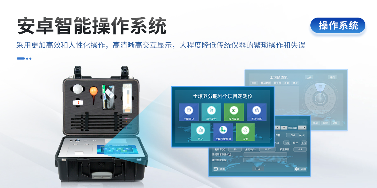 | 安卓智能操作系統(tǒng)Android 7.1版本,主控芯片采用ARM Cortex-A7,RK3288/4核處理器,主頻1.88Ghz,運轉(zhuǎn)速度更快速,穩(wěn)定性更強。 | 可檢測各種土壤、肥料、作物、食品、水質(zhì)、環(huán)境等共200多個測試項目,一機多用,功能齊全。 | 測試速度更快!無需空白對照和標準校準,省卻以往繁瑣的操作步驟,一鍵式操作,直接讀取數(shù)據(jù),**率,低消耗。 | 12個旋轉(zhuǎn)檢測通道,一次性可快速檢測12個樣品,極大提升檢測效率,降低檢測成本。 | 采用高精度濾光片技術(shù)自主**分析方法(**號:ZL 2020 2 1763837.9),**認證。 | 具有自身保護功能,內(nèi)置人臉識別攝像頭可掃臉登錄,也可設(shè)置用戶名和密碼,防止非工作人員操作查看實驗數(shù)據(jù)。 | 檢測過程中內(nèi)置校準功能,智能恒流穩(wěn)壓,光強自動校準,確保檢測準確度,取得中國計量科學研究院的《校準證書》 | 內(nèi)置傳感器航空接口,插拔方便,配備FDR傳感器、環(huán)境多要素傳感器。 | FDR傳感器為土壤三參數(shù)一體式,可同時測量土壤水分含量、土壤環(huán)境溫度、土壤電導率(鹽分)方便快捷。 | 環(huán)境多要素傳感器為6要素一體式,可同時測量空氣溫度、空氣濕度、露點、大氣壓力、光照度、二氧化碳。 | 儀器標配wifi無線上傳、4G聯(lián)網(wǎng)傳輸、GPRS無線遠傳,快速上傳數(shù)據(jù)。 | 配有智慧云農(nóng)業(yè)平臺,儀器連入無線網(wǎng)絡(luò)后,可將檢測數(shù)據(jù)可選擇性或批量無線上傳,方便用戶進行數(shù)據(jù)管理和長期分析。 | 儀器配同時具有USB接口、以太網(wǎng)接口,內(nèi)置大容量內(nèi)存,并可隨時用U盤拷貝數(shù)據(jù)。 | 可用手機隨時登錄云平臺在線移動查看歷史數(shù)據(jù) | 內(nèi)置作物專家施肥系統(tǒng),可對百余種全國農(nóng)業(yè)經(jīng)濟作物、果樹等的目標產(chǎn)量計算推薦施肥量,依據(jù)施肥配方科學指導農(nóng)業(yè)生產(chǎn)。測土配方施肥結(jié)果可打印,打印內(nèi)容包含:作物種類、肥料種類、目標產(chǎn)量、需求總量、建議施肥方案。 | 內(nèi)置植物營養(yǎng)診斷標準圖譜,根據(jù)各農(nóng)作物營養(yǎng)缺失的圖片,進行葉面對比,診斷豐缺。 | 4波長專業(yè)測試冷光源(紅、藍、綠、橙),光源波長穩(wěn)定,長時間連續(xù)工作光源無溫漂現(xiàn)象,壽命長達10萬小時級別,重現(xiàn)性好,準確度高。 | 比色池部分采用標準1cm比色皿,無機械位移及磨損,光路測試定位**,有效屏蔽外光干擾,保證檢測結(jié)果優(yōu)于國標要求。 | 儀器系統(tǒng)內(nèi)帶有樣品前處理操作視頻,各種樣品檢測方法點擊視頻模塊即可觀看,檢測人員無需自學說明書,指導教學方便快速,方便新手快速操作。 | 內(nèi)置新一代高速熱敏打印機(無需色帶),打印內(nèi)容包含:檢測單位、檢測人員、檢測項目、通道號、吸光度、養(yǎng)分含量(mg/kg)、檢測時間、以及二維碼等信息 | 高靈敏7寸真彩觸摸屏,采用更加**和人性化操作,高清晰高交互顯示,大程度降低傳統(tǒng)儀器的繁瑣操作和失誤,并取得多項《軟件著作權(quán)》。 | 內(nèi)置時鐘功能,方便操作時間記錄,長期歷史追溯。 | 可設(shè)置多賬戶賬號密碼登錄,**UI交互界面,不同的用戶可自由添加編輯檢測信息,保存后可長期使用。 | GPS功能:可在野外作業(yè)時記錄經(jīng)緯度地點,滿足特殊用戶需求。 | 內(nèi)置低電壓提示功能,可在檢測時明確電量,避免測試數(shù)據(jù)偏移,同時具有斷電保護功能,斷電自動保存數(shù)據(jù),防止數(shù)據(jù)丟失。 | 交直流兩用供電方式,內(nèi)置大容量充電鋰電池,滿電狀態(tài)下可連續(xù)工作10余小時,同時可外接車載電源蓄電 | 儀器具有中英文切換功能,可滿足出口要求。 | 高強度PVC工程塑料手提箱設(shè)計,堅固耐用,便于攜帶。 |