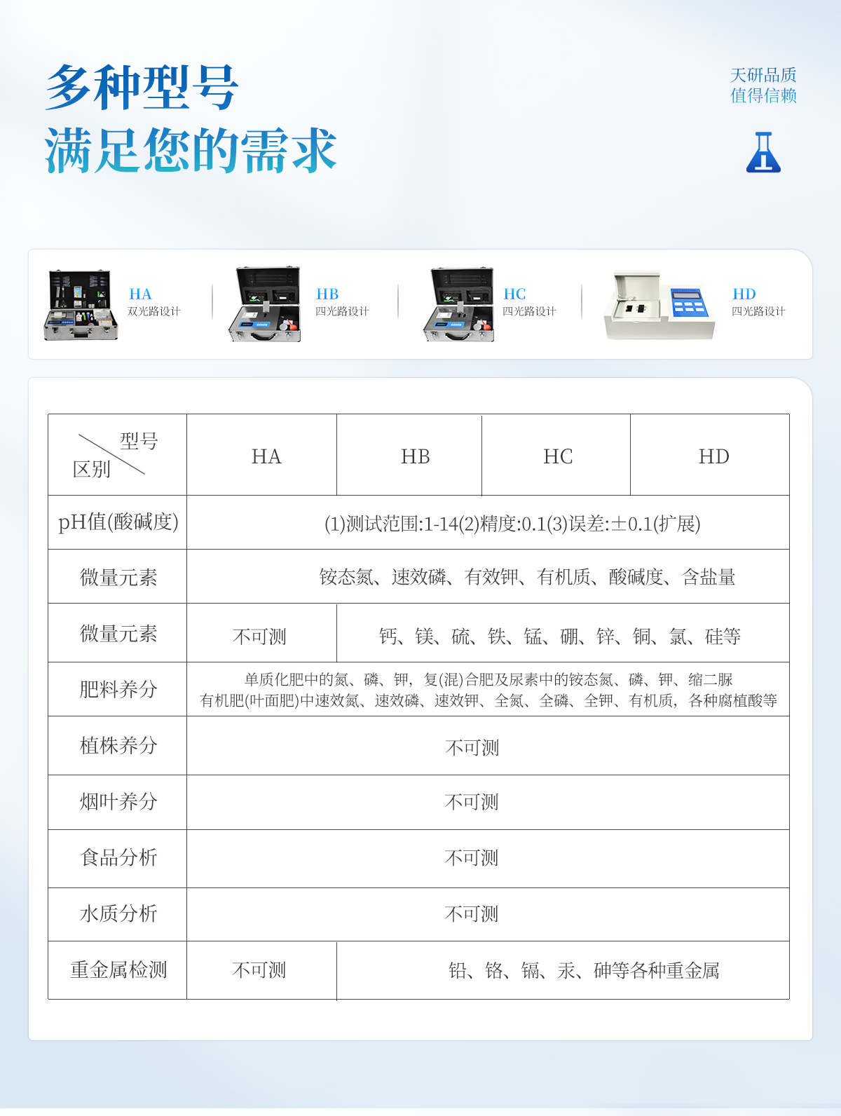 | 升級(jí)款,噴塑鋼板外殼設(shè)計(jì),堅(jiān)固耐用,配套成套附件及成品藥劑。 | 微電腦控制,數(shù)字化線路、程序化設(shè)計(jì),液晶顯示,交直流兩用,可野外流動(dòng)測(cè)試。 | 分辨率:0.001,觸摸式按鍵,內(nèi)置新一代熱敏打印機(jī),可打印測(cè)試結(jié)果。 | 肥料養(yǎng)分專用檢測(cè)儀可檢測(cè)化肥、有機(jī)肥(含葉面肥、水溶肥、噴施肥等)中的速效氮、速效磷、有效鉀、全氮、全磷、全鉀、有機(jī)質(zhì)、酸堿度,鈣、鎂、硫、鐵、錳、硼、鋅、銅、氯、硅等各種中微量元素以及鉛、鉻、鎘、汞、砷等各種重金屬含量。 | 采用高亮LED燈光源、雙撥輪濾光式處理技術(shù),保證光源波長穩(wěn)定, 硅半導(dǎo)體作為信號(hào)接收系統(tǒng),壽命長達(dá)10萬小時(shí)級(jí)別。光源穩(wěn)定,重現(xiàn)性好,準(zhǔn)確度高。 | 比色槽部分采用單通道設(shè)計(jì),無機(jī)械位移及磨損,光路測(cè)試定位**,保證測(cè)定結(jié)果精度。 | 采用自主分析方法(號(hào):ZL 2018 2 1777724.7),保證檢測(cè)結(jié)果絕對(duì)達(dá)到國標(biāo)要求。 | 內(nèi)置熱敏打印機(jī),肥料打印結(jié)果為百分含量,測(cè)試誤差小于0.5%。 |