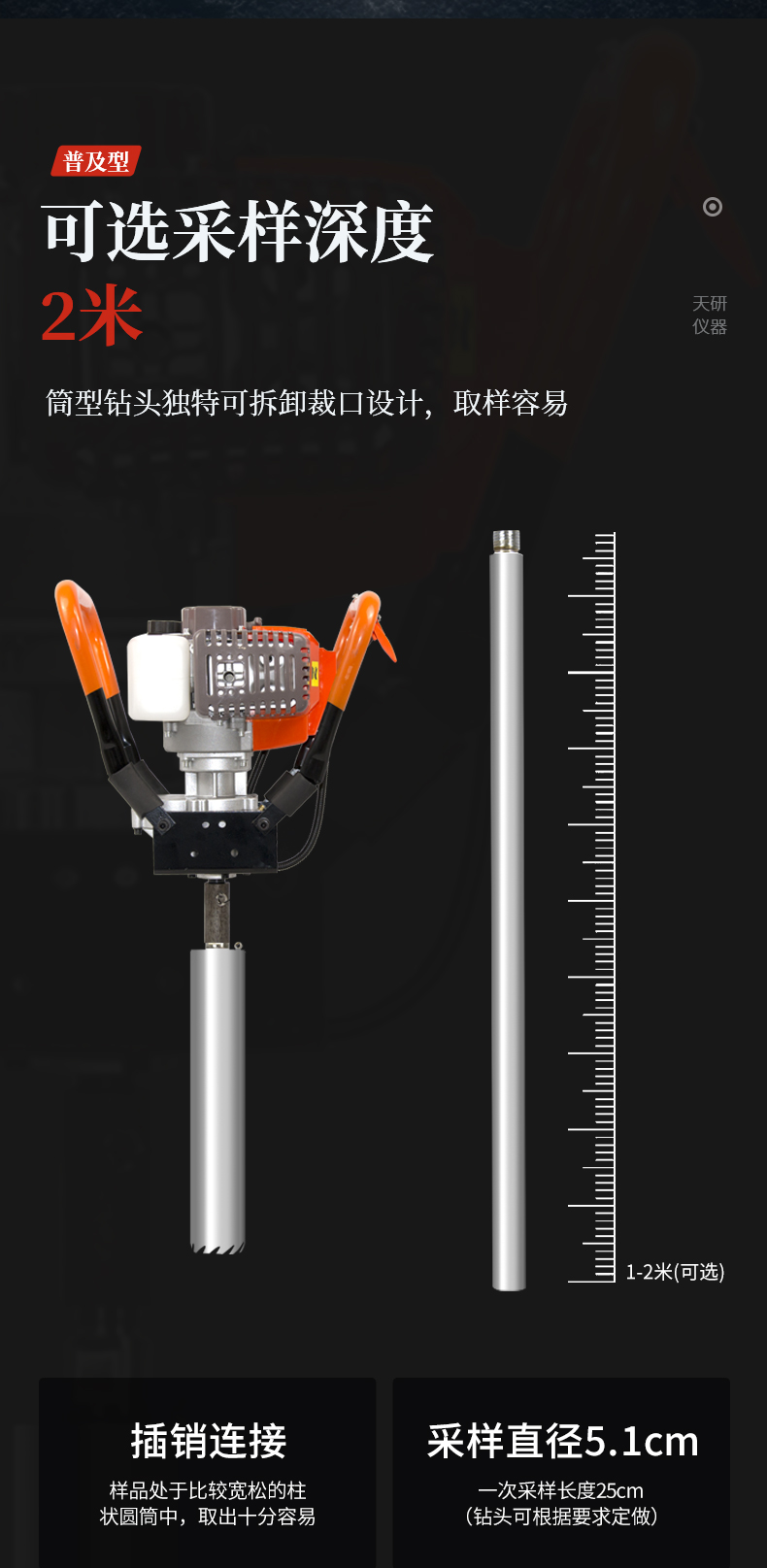 | 規(guī) 格: 采樣直徑5.1cm、一次采樣長度25cm(鉆頭可根據(jù)要求定做) | 采樣深度:2米,延長桿插銷連接。 | 發(fā)動機(jī)形式:風(fēng)冷單缸二沖程 | 發(fā)動機(jī)排量:52CC | 發(fā)動機(jī)功率:1.9kw/7000r/min | 齒輪箱配置:采用齒輪二級變速,軸承轉(zhuǎn)動 | 傳動方式:齒輪變速傳動 | 啟動方式:手拉反沖起動 | 燃油比:93號汽油與二沖程機(jī)油25:1 | 燃油箱容積:1200ml | 凈 重:20kg |